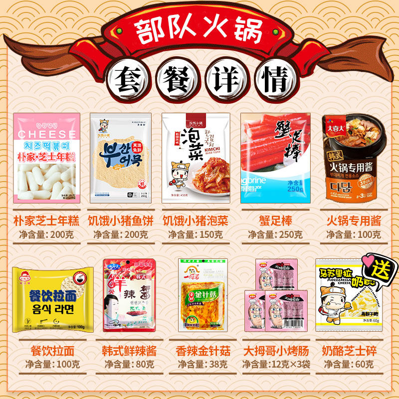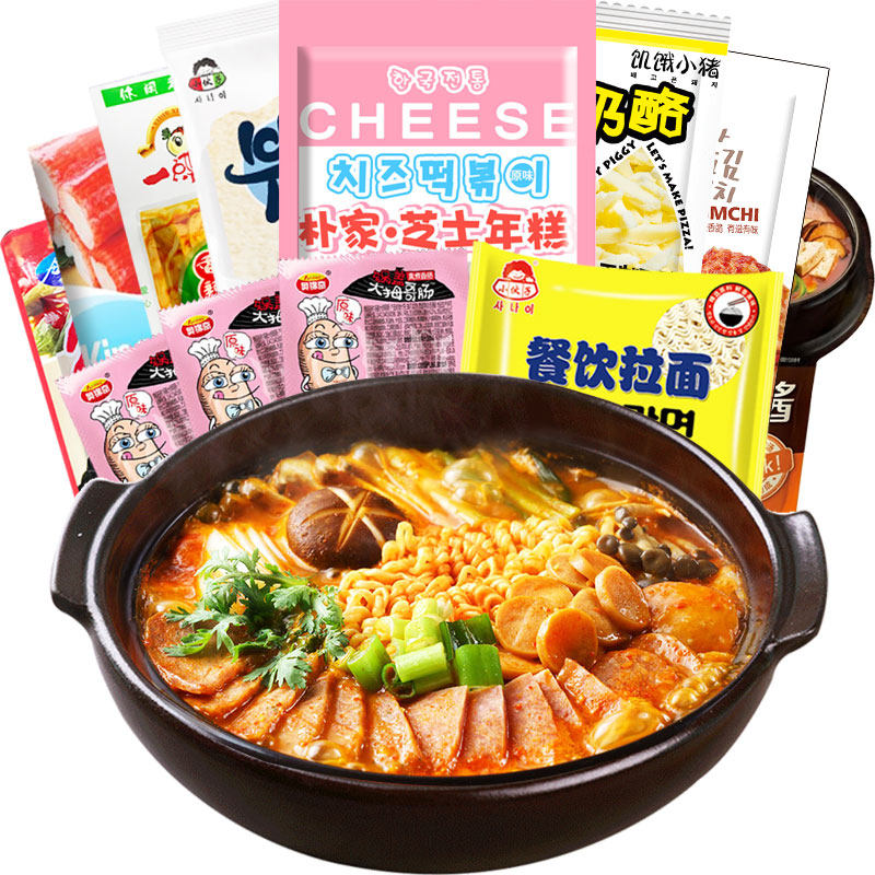 Cheese rice cake Catering ramen Cheese cheese fish cake Kimchi small sausage Crab stick Hot pot sauce Fresh hot sauce Mushroom