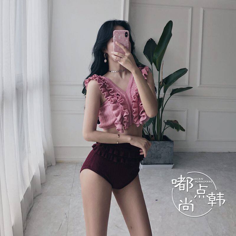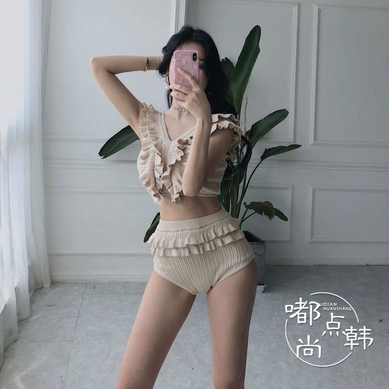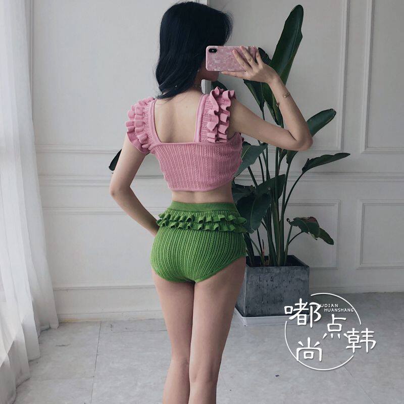 Korean knitted two-piece bikini three-piece swimsuit Women's small chest gathered steel tray hot spring swimming suit