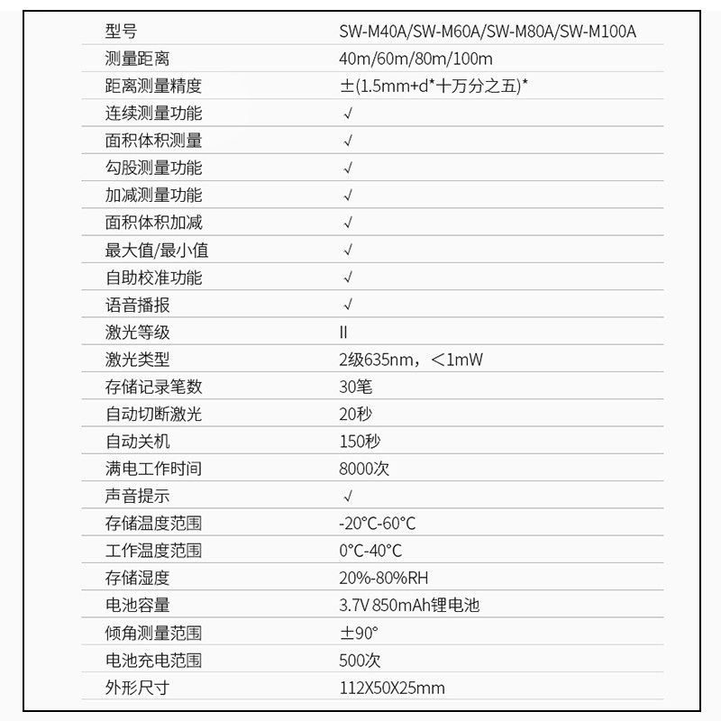 G4S-40 meters entry-level model (limited to 5 units) 50 meters standard model (double sensor hole + double horizontal bubble) 70 meters standard model (double photosensitive hole + double horizontal bubble) 100 meters standard model (double photosensitive hole + double horizontal bubble) 120 meters standard model (double photosensitive hole + double horizontal bubble) 50 meters upgrade model (voice broadcast + lithium direct charging + electronic level) 60 meters upgrade model (voice broadcast + lithium direct charging + electronic level) 70 meters upgrade model (voice broadcast + lithium direct charging + electronic level) 80 meters upgrade model (voice broadcast + Lithium battery direct charging + electronic level) 100 meters upgrade model (voice broadcast + lithium battery direct charge + electronic level) 120 meters upgrade model (voice broadcast + lithium battery direct charge + electronic level) 50 meters green light upgrade model (indoor and outdoor universal + dual power supply + voice broadcast) 70 meters green light upgrade model (indoor and outdoor universal + dual power supply + voice broadcast) 100 meters green light upgrade model (indoor and outdoor universal + dual power supply + voice broadcast) 50 meters drawing model (mobile phone APP + 3D floor plan + export CAD) 70 meters drawing model (mobile app+ 3D Floor Plan + Export CAD) 100m Drawing Model (Mobile APP + 3D Floor Plan + Export CAD) 80m Video Model (16G Capacity + Video Recording Picture + Electronic Level) 120m Video Model (16G Capacity + Video Audio Picture + Electronic Level) 200m Video Model (16G Capacity + Video Audio Picture + Electronic Level) 50m Upgrade S Model (Electronic Level + Data Storage + Connected Computer) 70m Upgrade S Model (Electronic Level + Data Storage + Connected Computer) 100 meters upgrade S model (electronic level + data storage + connected computer) English model