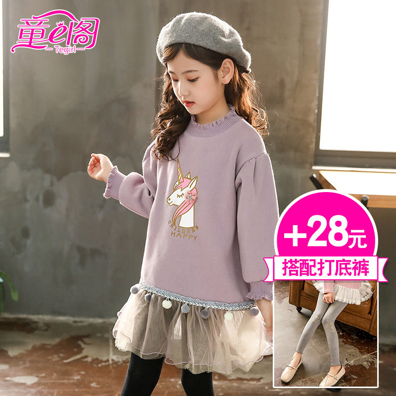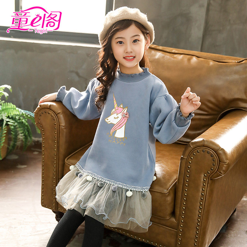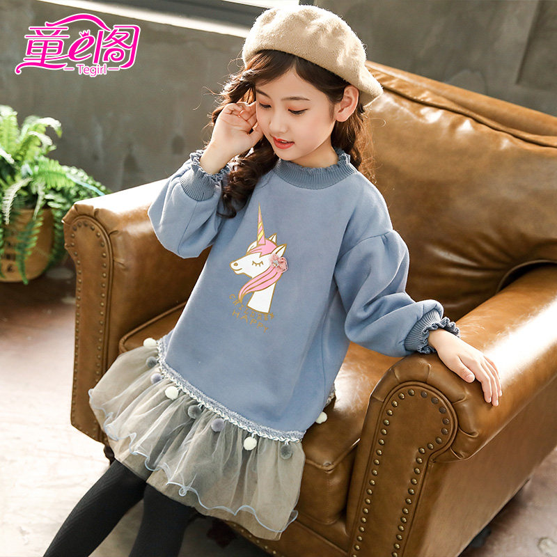 Girls long-sleeved dress mesh skirt spring new round neck sweater skirt spring big children unicorn cartoon