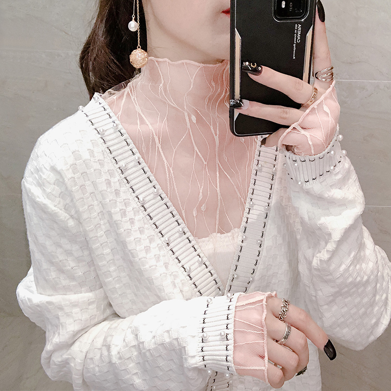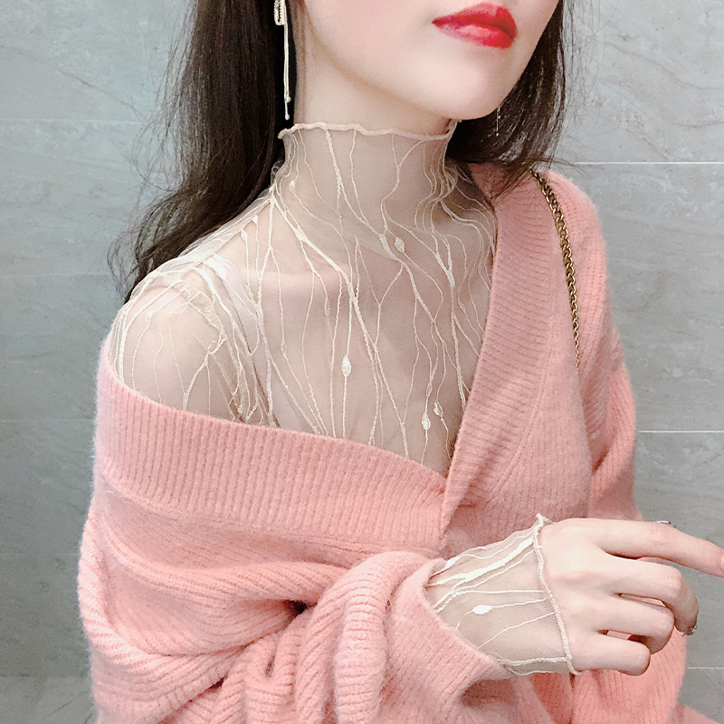 See-through sexy inner mesh base shirt Women's thin spring and Autumn tight transparent tulle turtleneck yarn lace top