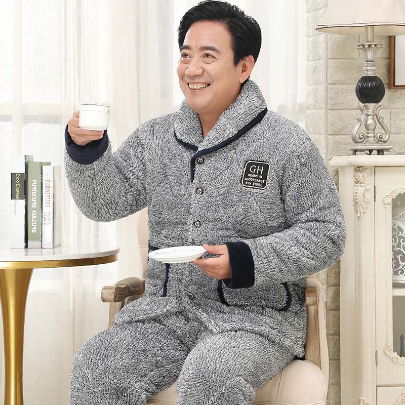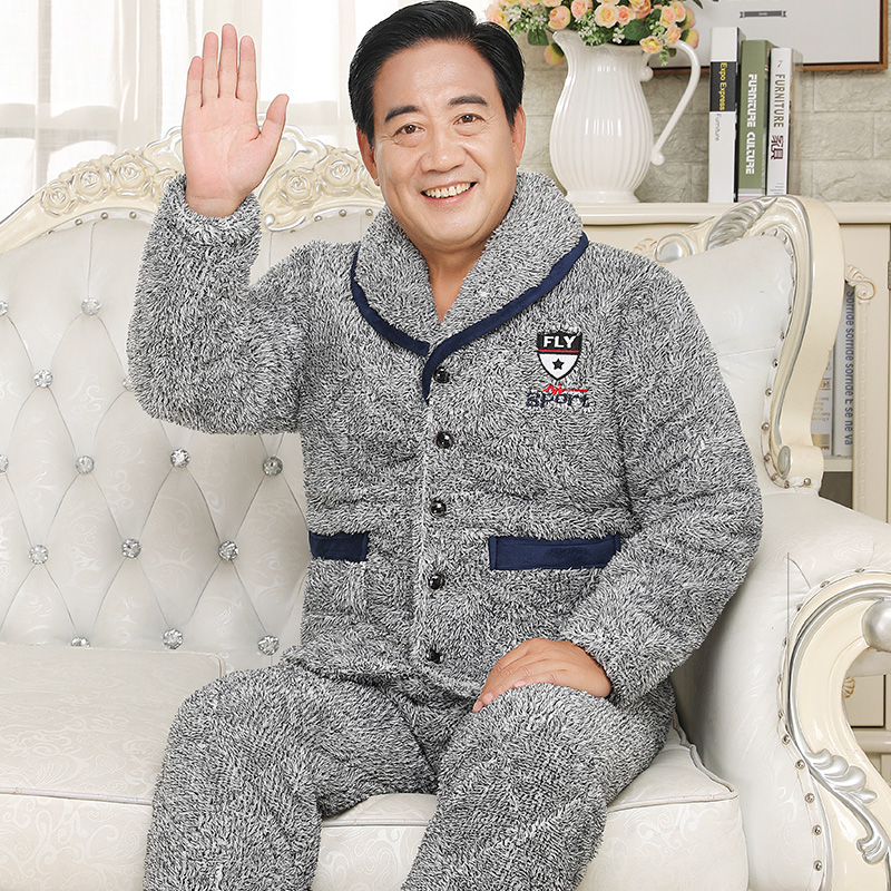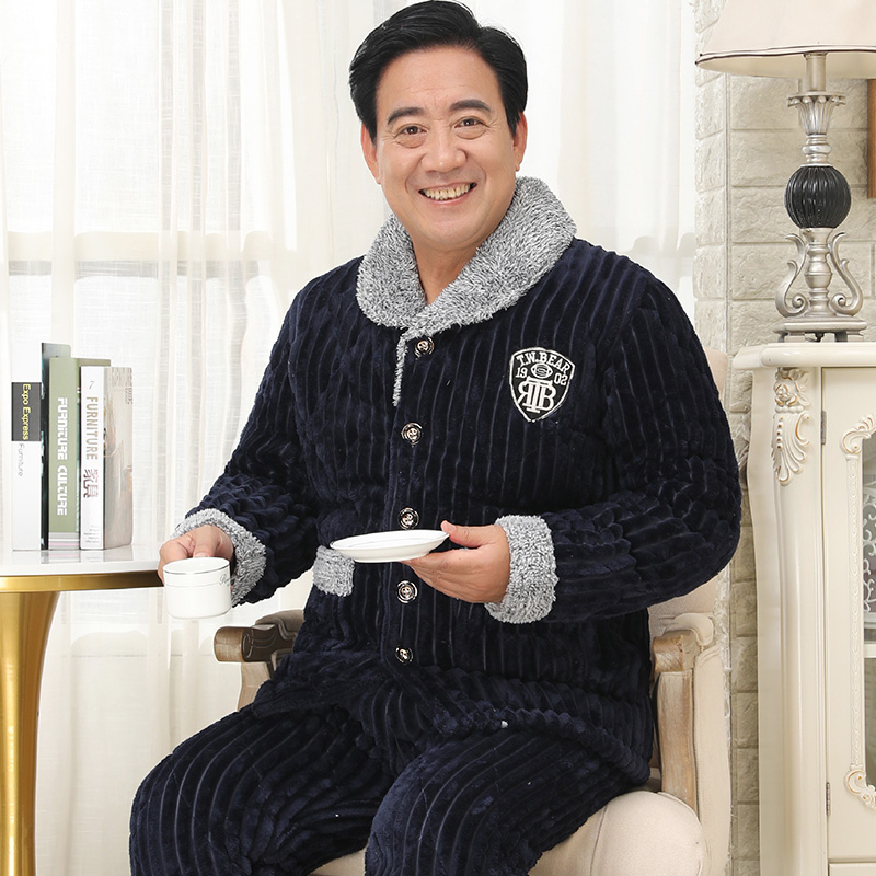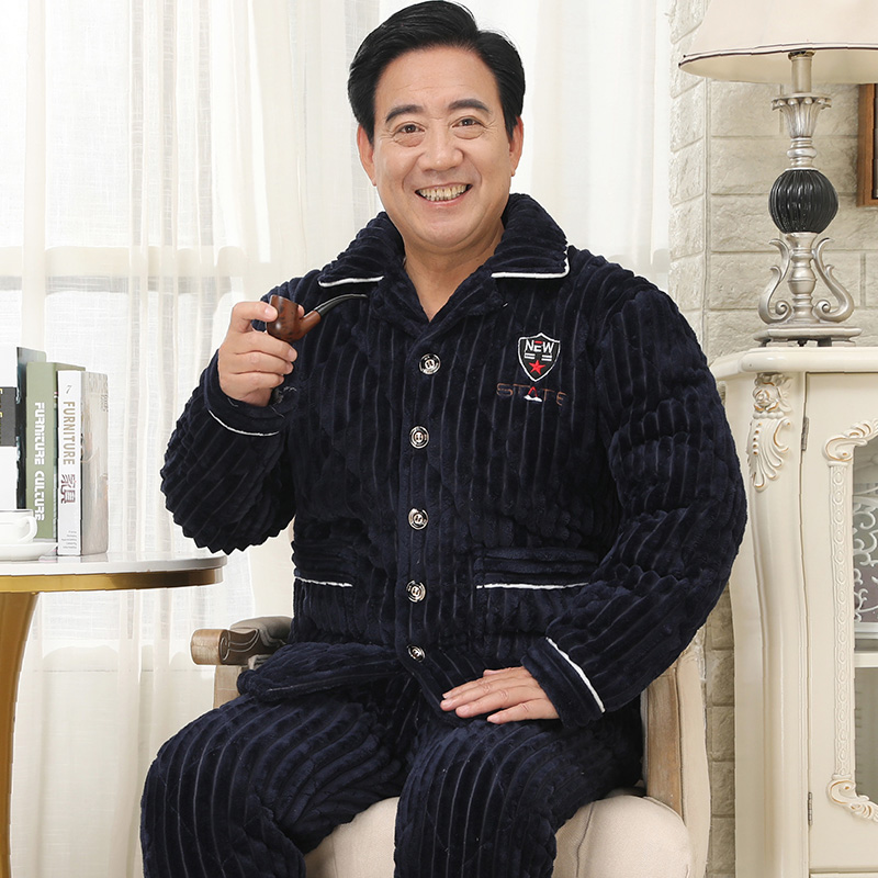 Winter three-tier cotton pyjamas men plus velvet thick warm coral velvet middle-aged old father old man winter suit