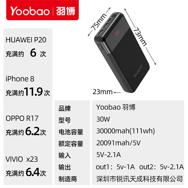 yoobao Yubo 30W large capacity 30000mAh digital display mobile charger for iPhone12 Apple vivo Android Huawei mobile phone universal 30000mAh for men and women