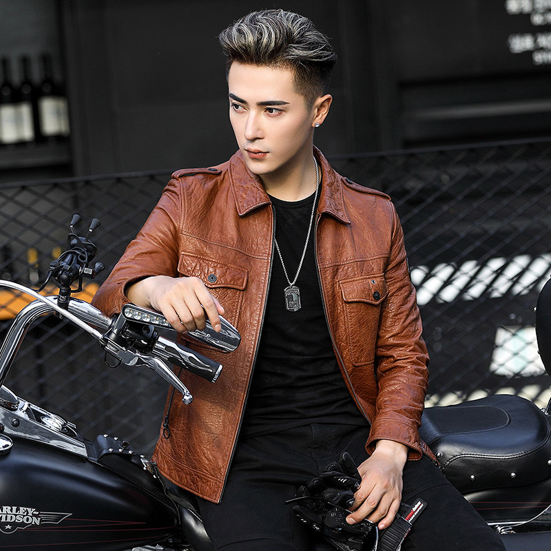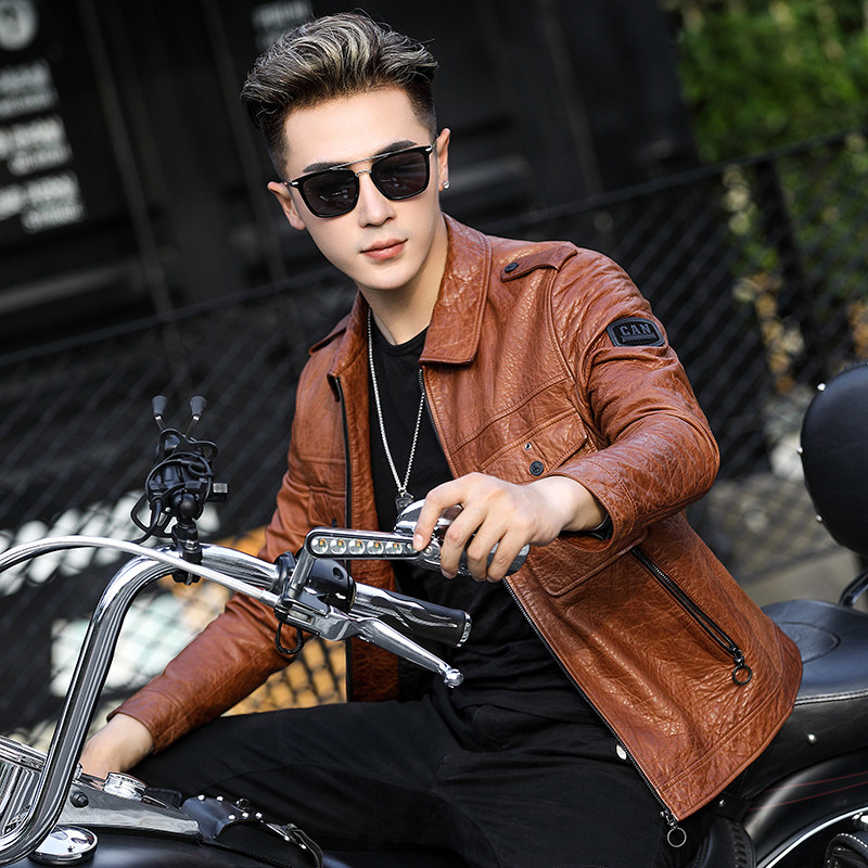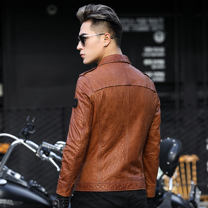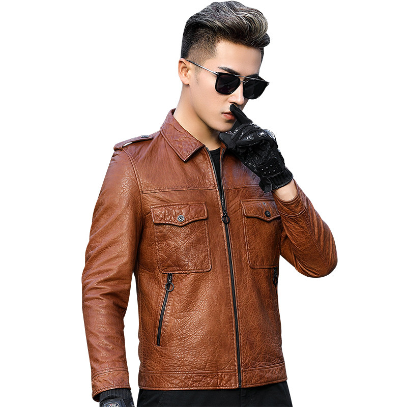 Henning Locomotive Clothing Leather Clothes Men Genuine Leather Short turning oil wax sheep leather jacket men's hunted jacket Chaoters