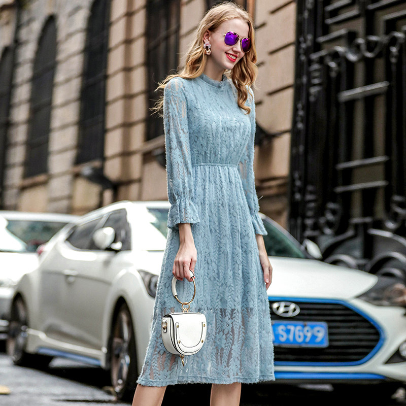 Plus velvet lace dress women 2021 early autumn new slim long sleeve temperament stand collar long version over the knee base skirt