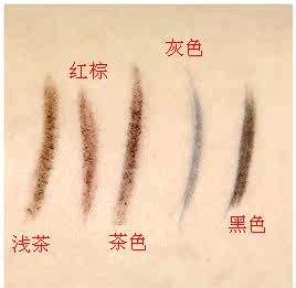 Reddish brown No 2 Gray (close to own eyebrow color) Black (eyeliner) Brown No 3 (dark brown) Light brown No 1 (light brown)
