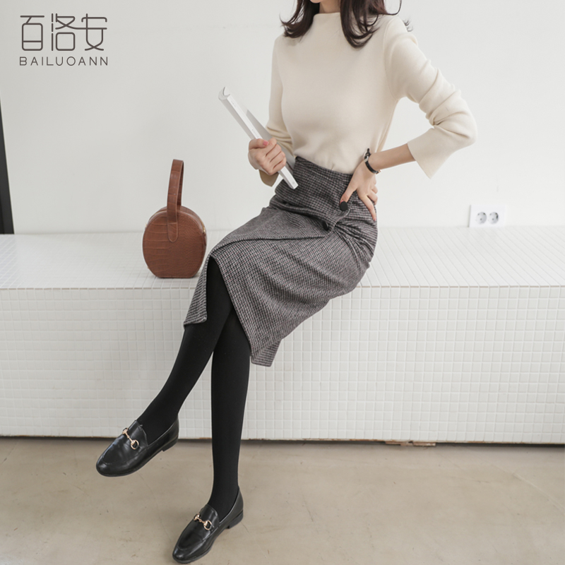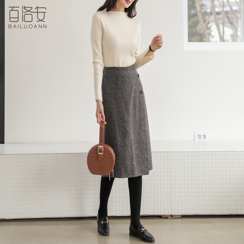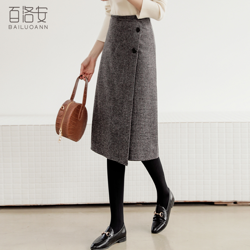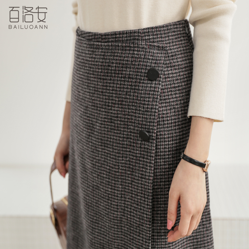 Bailuoan high waist plaid skirt women's autumn and winter new front slit bag hip midi skirt is thin and versatile A-line skirt