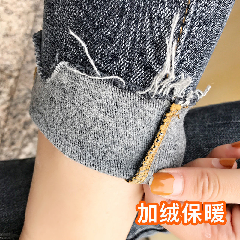 High-waisted hole velvet jeans women's nine points 2021 winter new thin thickened tight thin velvet small feet limited