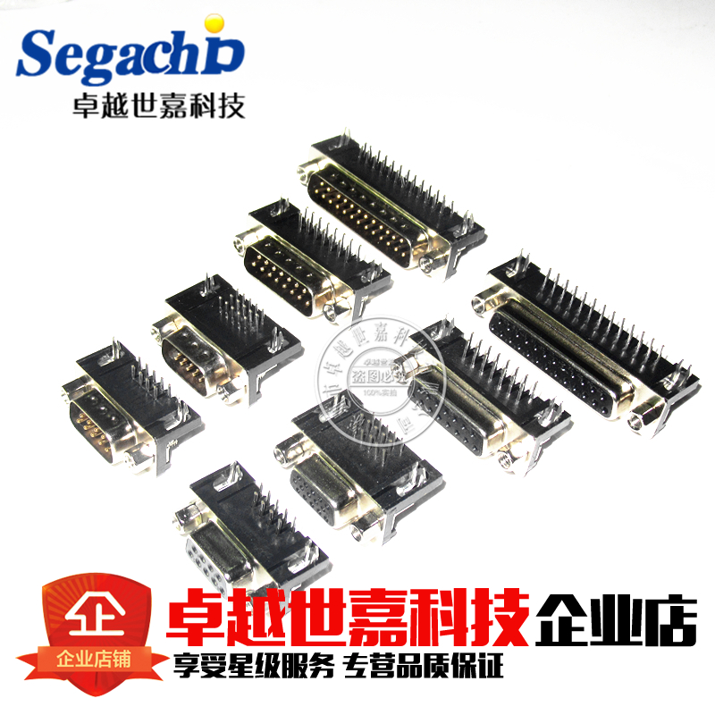 DR9 male head (two rows of 9 pins) DR9 female head (two rows of 9 pins) DR15 male head (two rows of 15 pins) DR15 female head (two rows of 15 holes) DR25 male head (two rows of 25 pins)