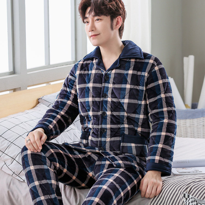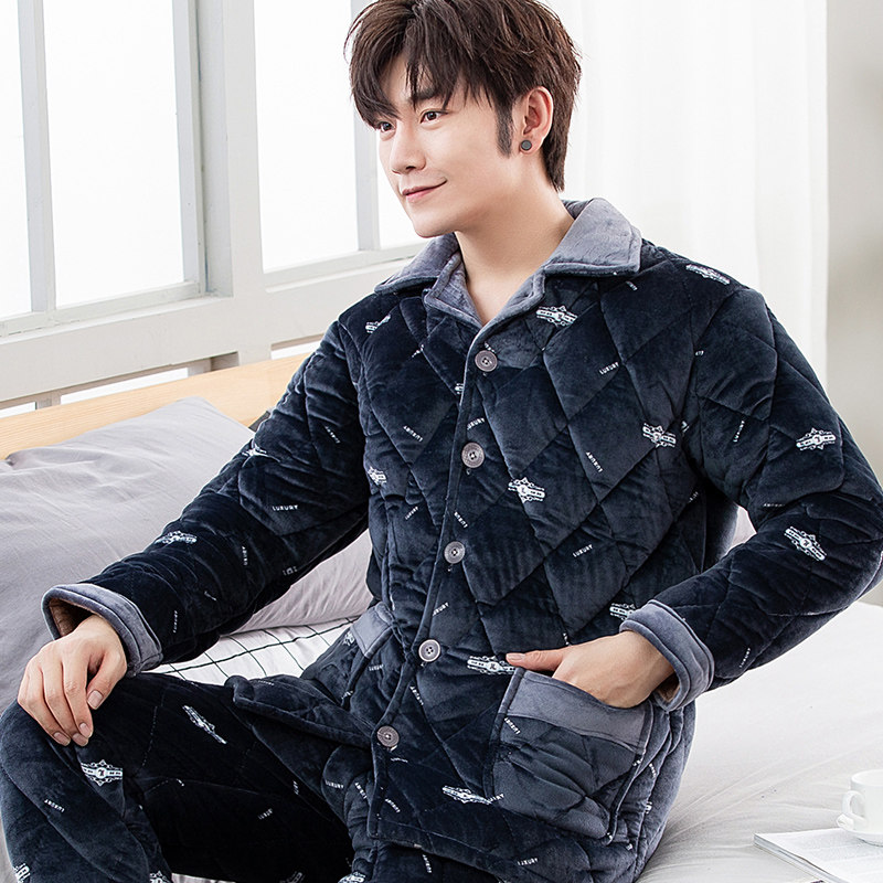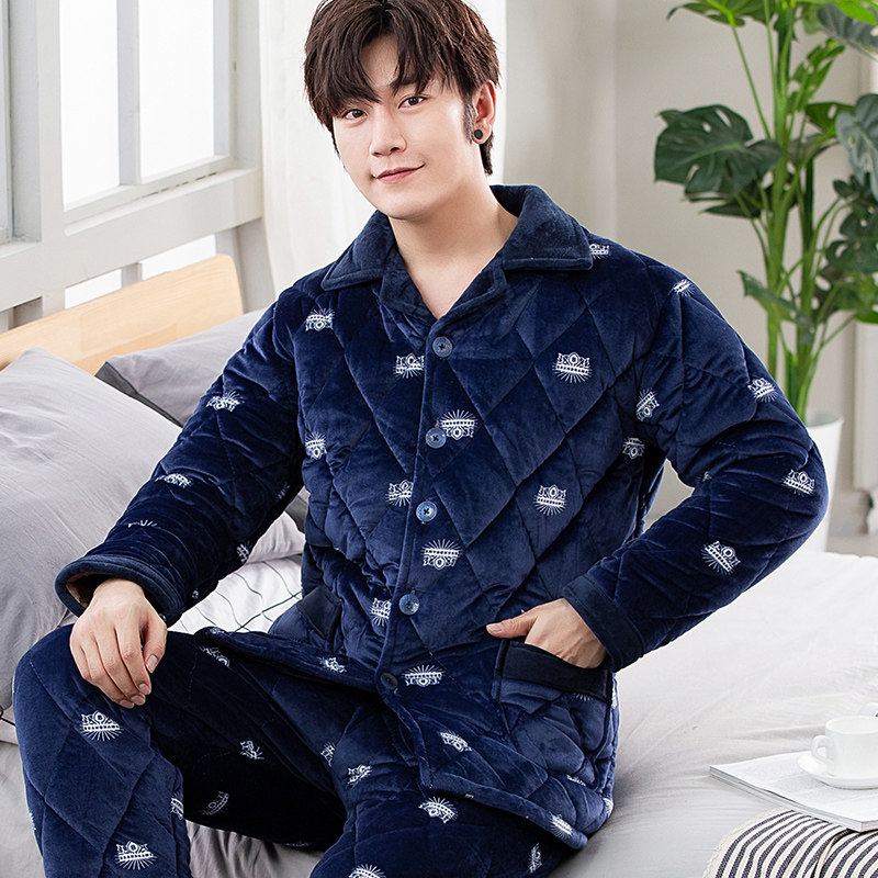 Winter Coral Velvet Men Closed Cotton Pajamas Thickened and Fall and Winter Flag Household Clothes Warm Set