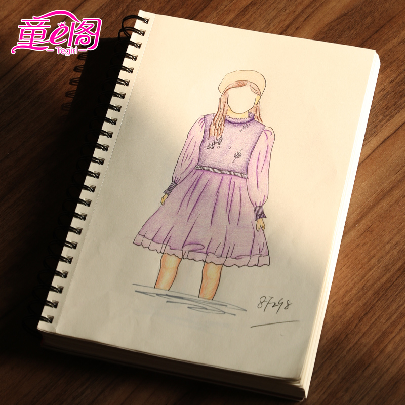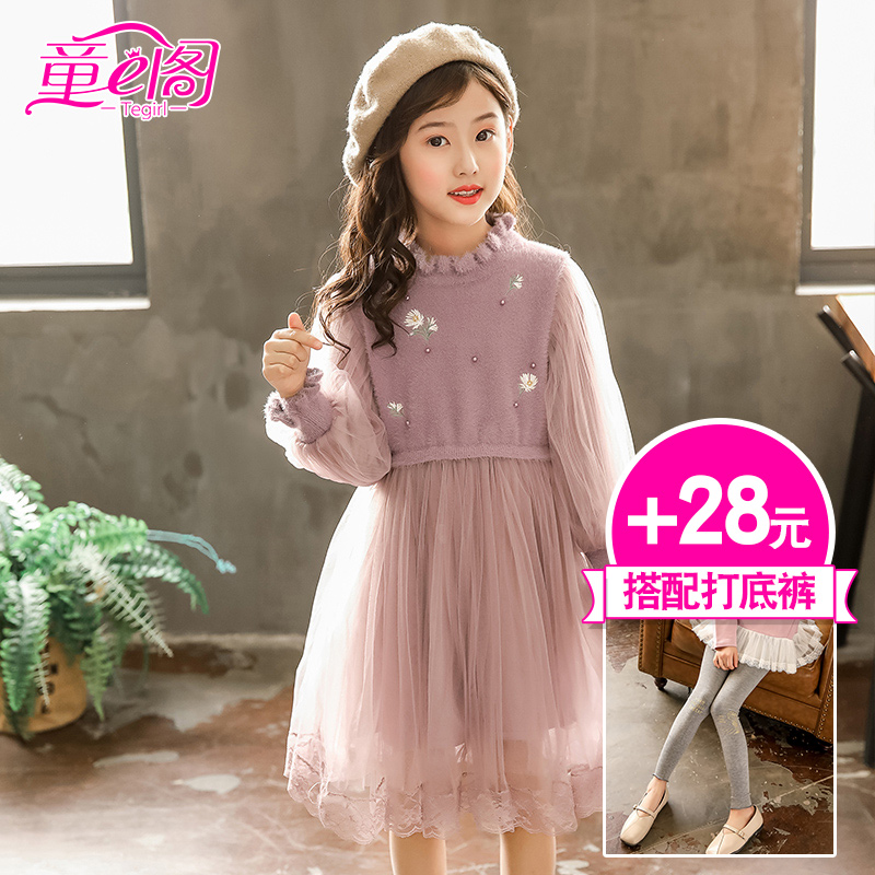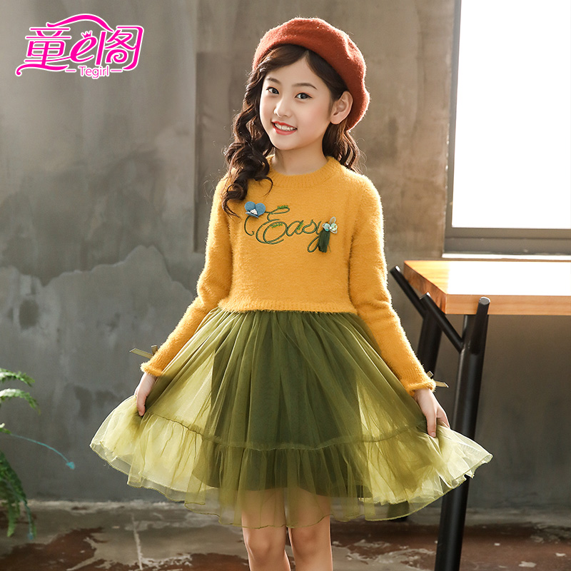 Girls ' long-sleeved dress Autumn and winter sweater stitching skirt Autumn children's clothing Lady children's long-sleeved children's mesh skirt