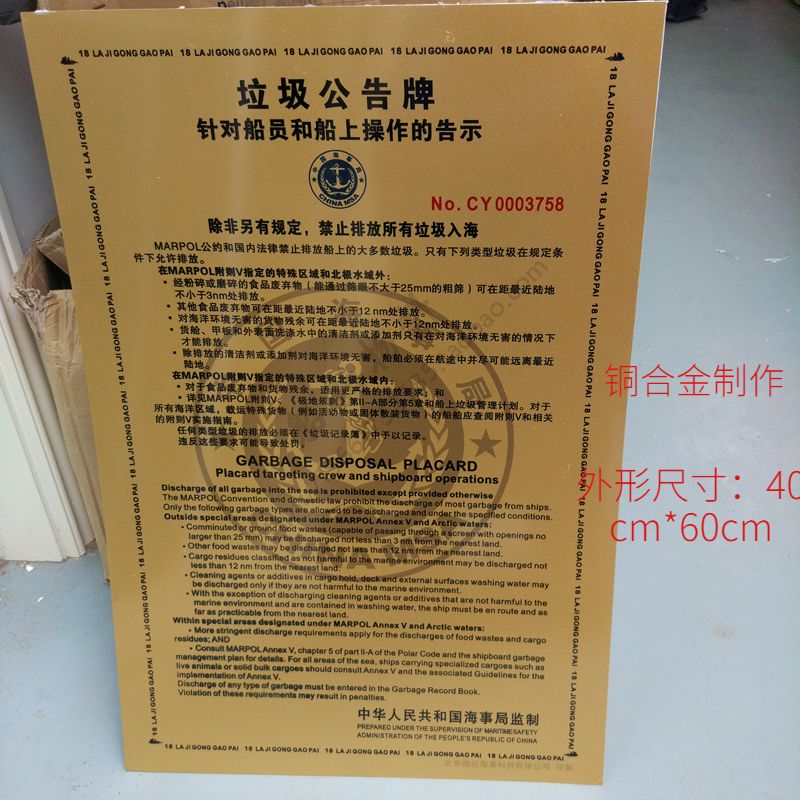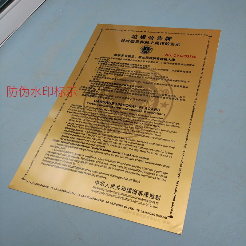 Garbage Bulletin Board 2018 New Edition Maritime Garbage Card Chinese and English International Coastal Copper Surface Maritime Bureau Back Adhesive