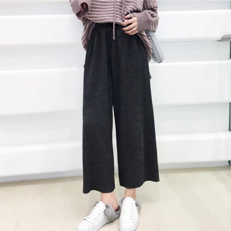 Beige sweater Grey wide leg pants Purple sweater Black wide pants