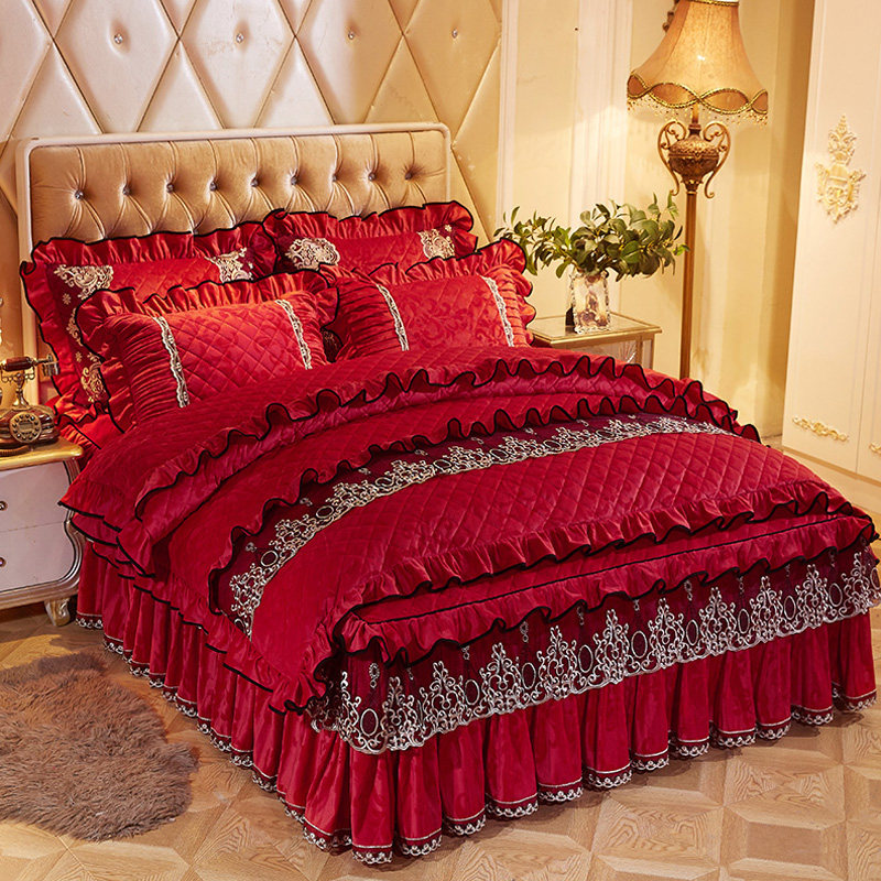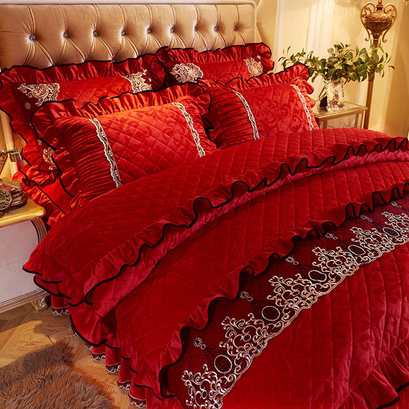 Eurostyle Wedding Bed Skirt Four Pieces Wedding Big Red Clips Cotton Thickened Warm Heathen Goose Down Embroidery Plus Suede Bed Cover
