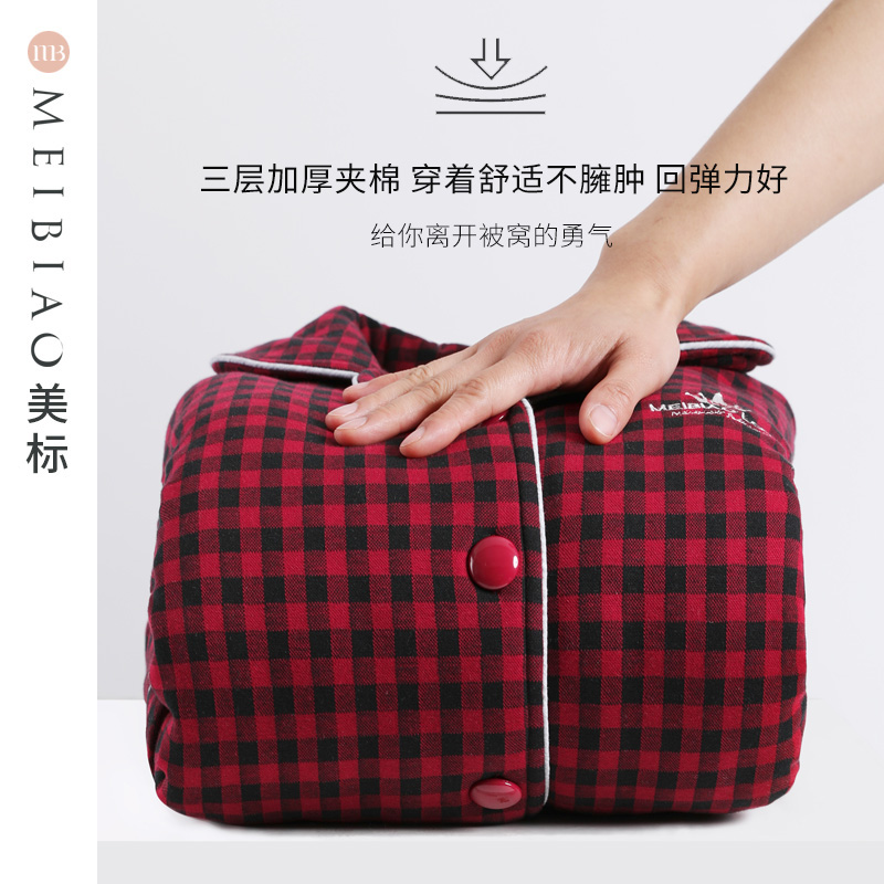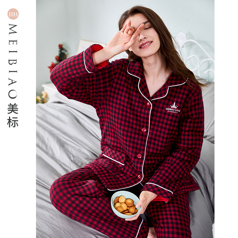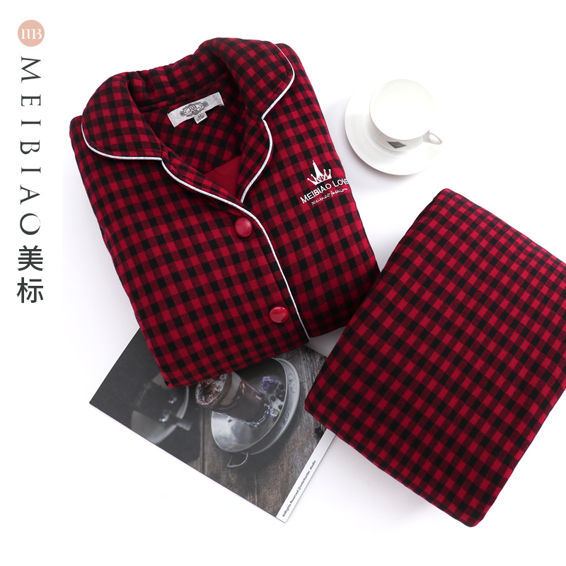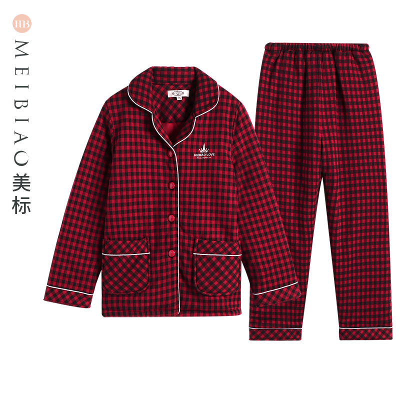 American Long-sleeved padded cotton cotton pajamas Women's autumn and winter three-layer thickened warm cotton plaid home suit suit