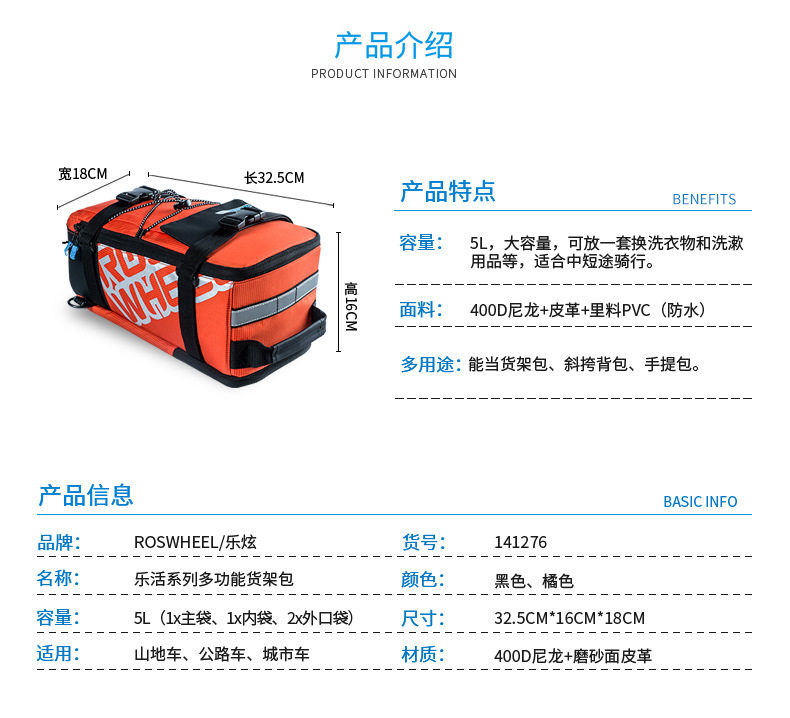 ROSWHEEL MUSIC DAZZLING 141276 Lelive series Mountaineering bike shelving bag for small piggybag bike riding