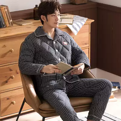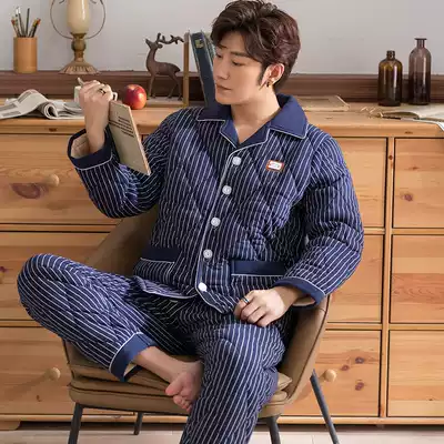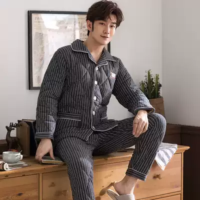 Three-layer cotton cotton pajamas men's winter thickened plus velvet home clothing coral fleece cotton men's autumn and winter warm