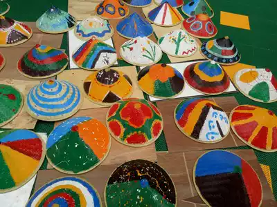 Kindergarten hand painting graffiti staircase corridor classroom wall decoration hanging ornaments wall decoration straw hat painting hat hat painting