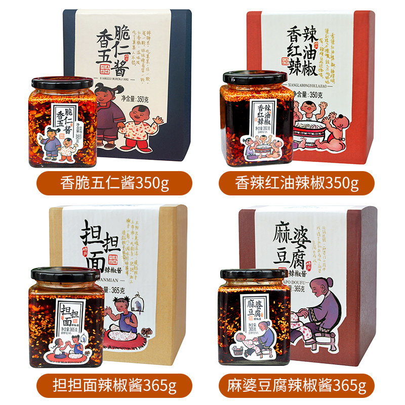 Glass bottle boxed 350g Crisp Five-jen Sauce Glass Bottle Boxed 350g Spiced Hot Red Oil Chili Glass Bottle Boxed 365g Shouldface Chili Sauce Glass Bottle Boxed 365g Sparkly Tofu