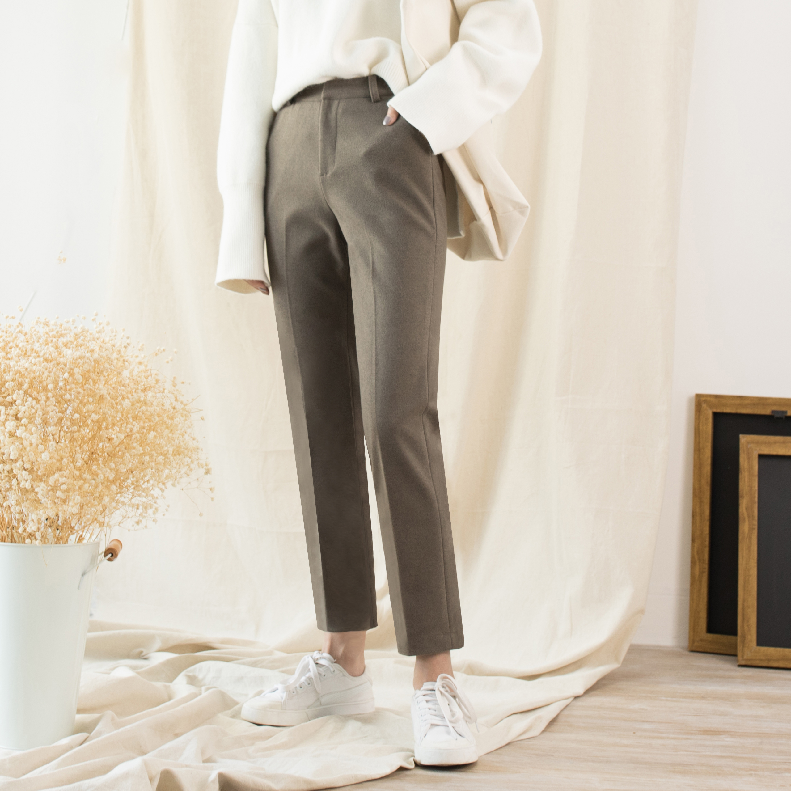 Honey tea brown autumn and winter thick wool pants casual trousers straight loose pants Tide small feet nine-point pants
