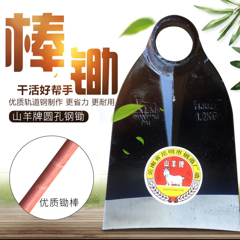 Yunnan Kunming local goat brand round hole steel hoe turning the ground hoe planting vegetables large farm tools pagoda wood hoe stick