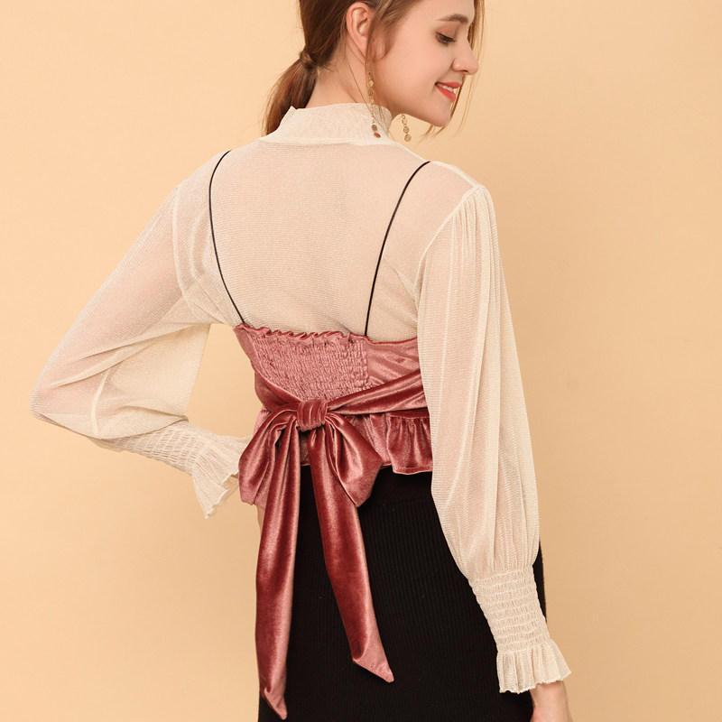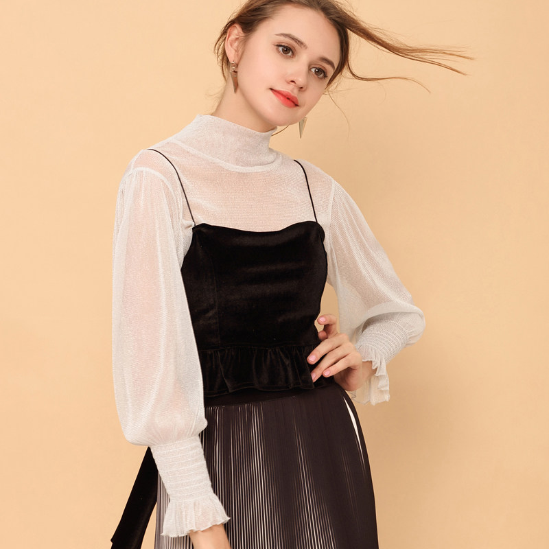 Perspective Sexy Mesh Yarn Undershirt Woman Transparent Thin inner lap Spring-in-spring-style Slim Veil half-height Collar Lace shabby blouse