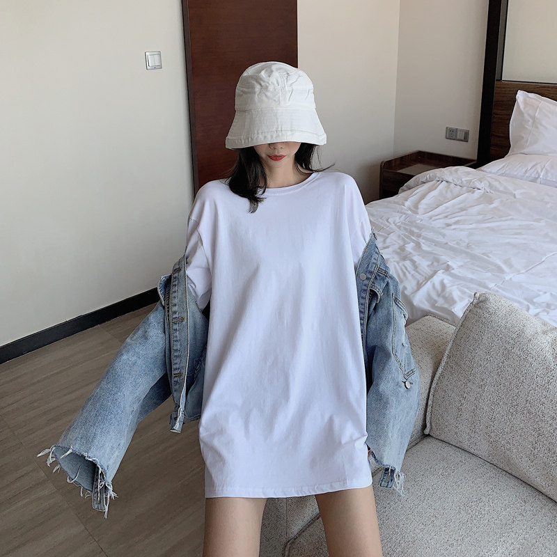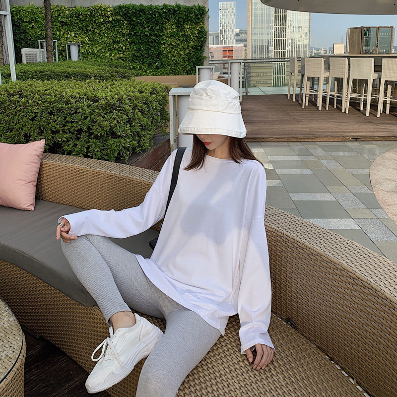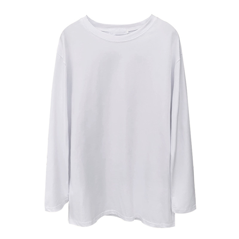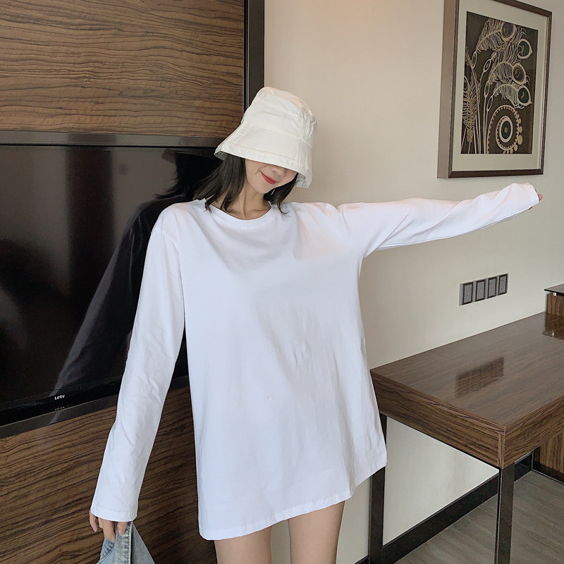 Korean spring and autumn simple and versatile solid color mid-length bottoming shirt cotton white t loose round neck long-sleeved T-shirt women's tide