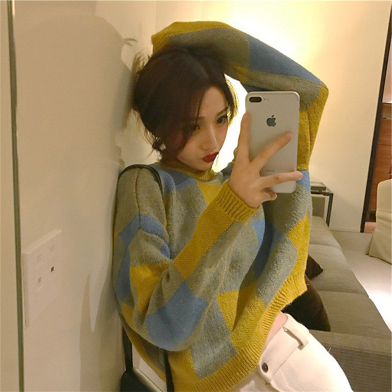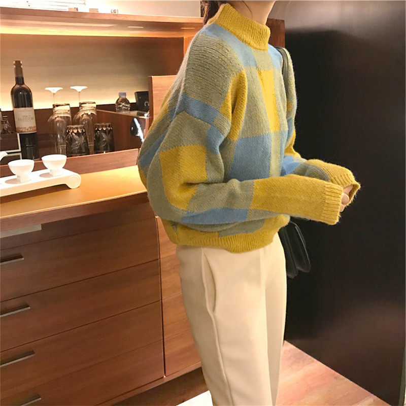 Plaid sweater almond-coloured broadlegged pants in the shape of a