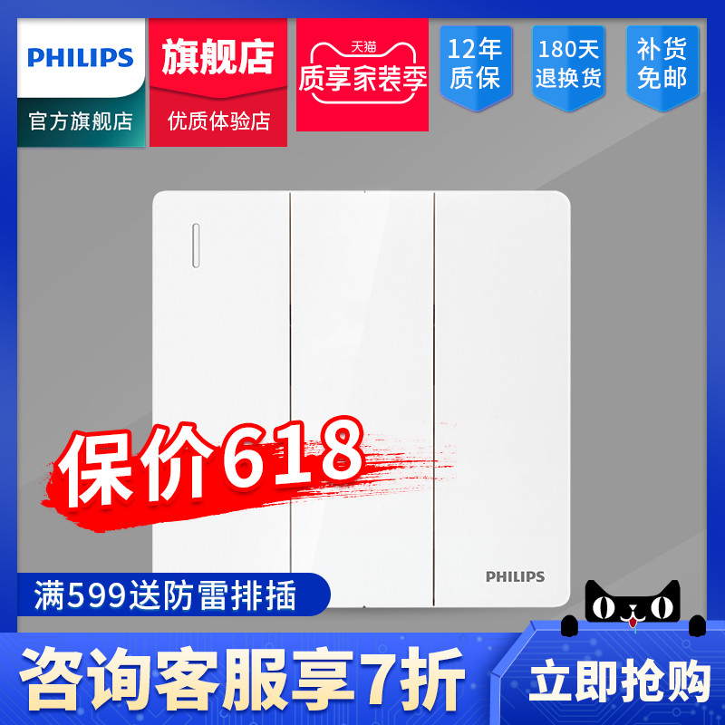 Philips Triple Switch Single Control Panel Home Furniture Wall Concealed Lamp Power Switch Socket WHITE
