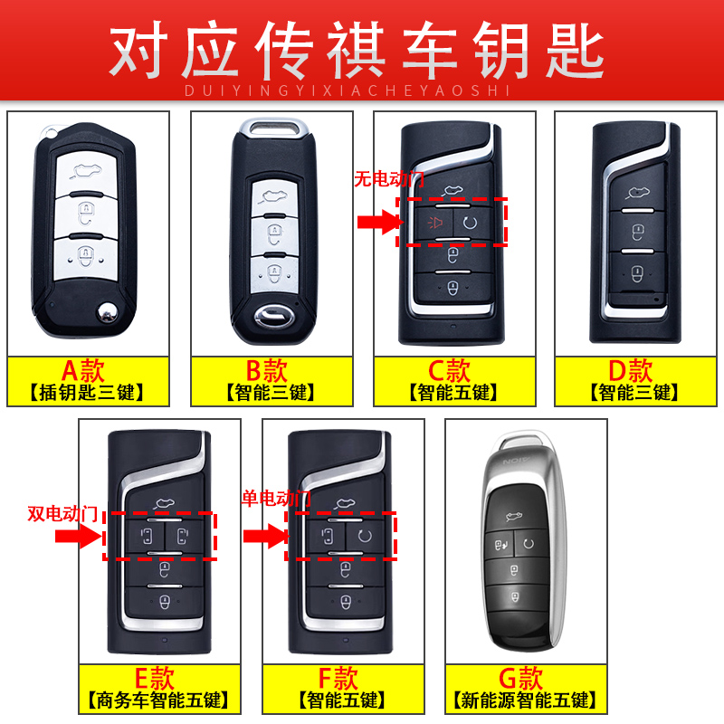Trumpchi A section-folding 3 keys Trumpchi B section-Intelligent 3 keys Trumpchi C section-Intelligent 5 keys Trumpchi D section-Intelligent 3 keys Trumpchi E section-Intelligent 5 keys (double electric door) Trumpchi F section
