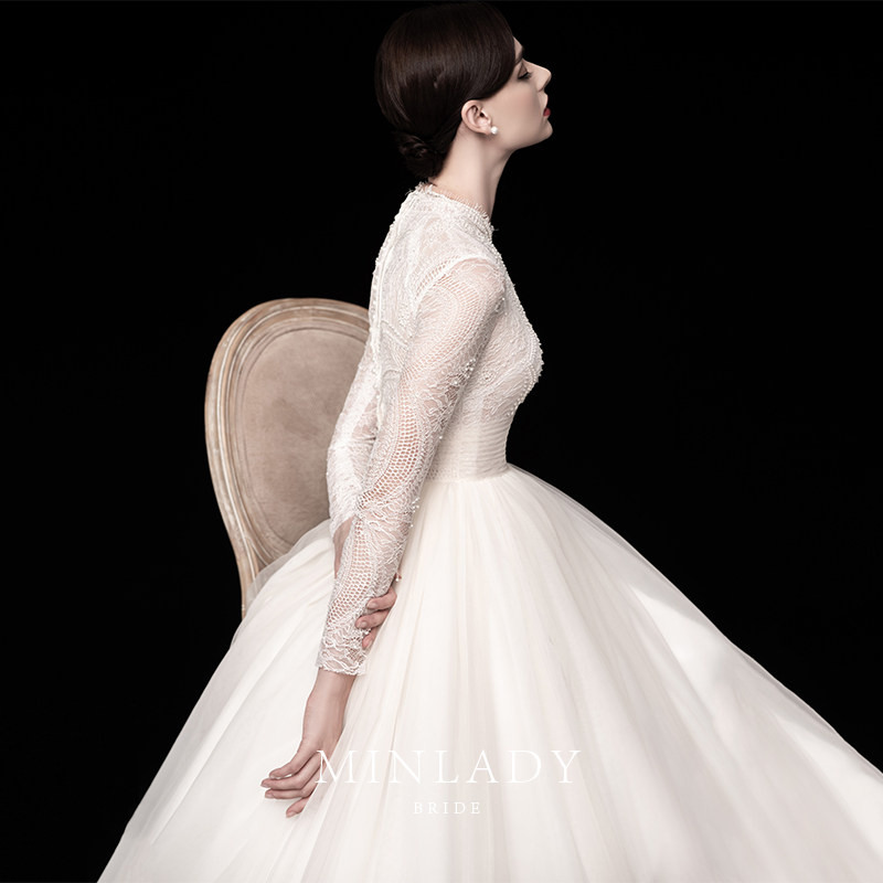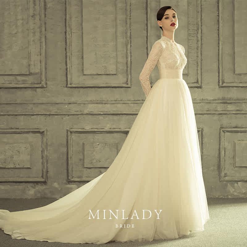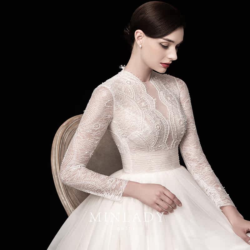 Wedding female 2021 new bride main yarn Hepburn wedding dress long sleeve lace vintage long tail shake sound wedding dress