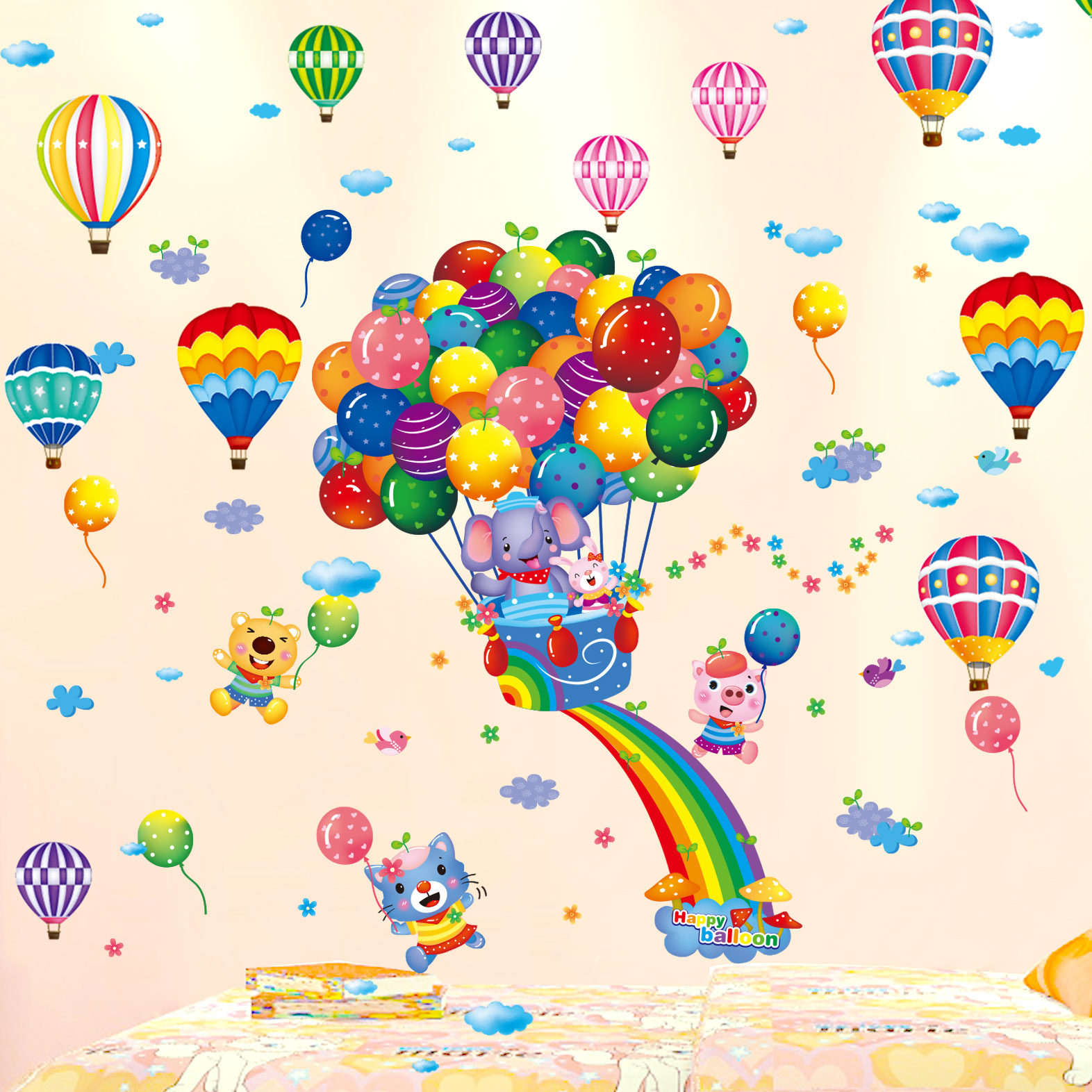 Rainbow animals (one in the main picture) Colorful hot air balloons (one in the main picture) Dinosaurs are coming (buy more and get coupons) Beautiful deer (show to a buyer if you are satisfied) Zoo (removable
