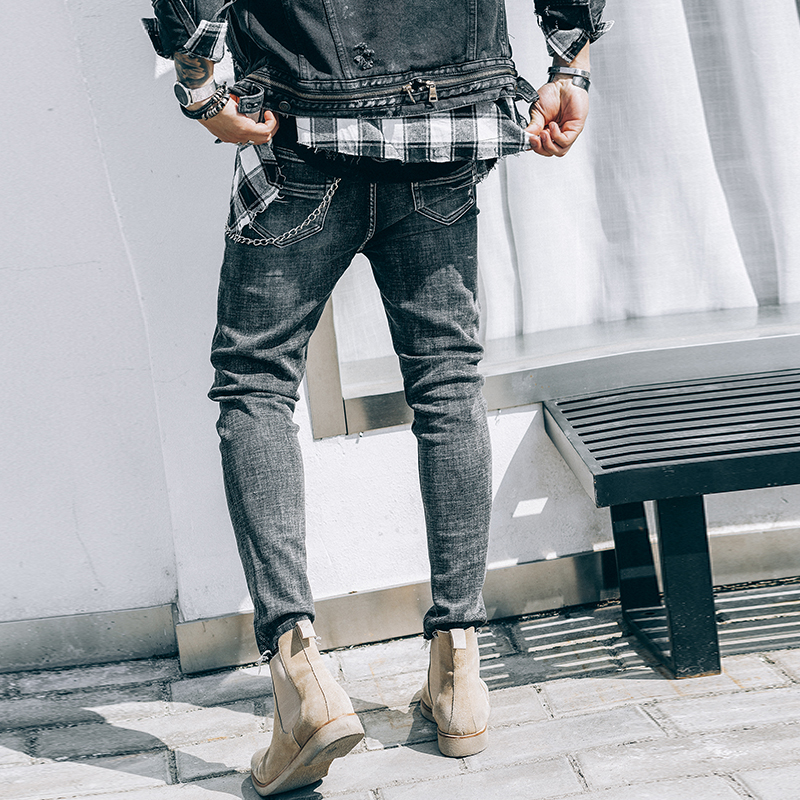 Tide brand spring and autumn high elastic smoke black fitness jeans men's slim casual training clothes small feet long pants