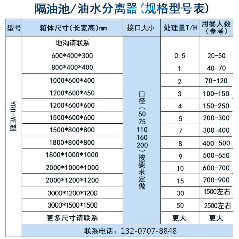 Trench please contact buried type 600 *400 *300mm buried type 800 *400 *400mm buried type 1000*600*400mm buried type 1200*600*450mm buried type 1200*600*600mm buried type 1500*600*600mm buried type 1200*800*800mm buried type 1500*800*800mm buried type 1800*800mm buried type 1800* 1000*1000mm buried type 2000*1000*1000mm buried type 2000*1200*1200mm buried type 2500*1200*1200mm buried type 3000*1200*1200mm buried type 3000*1500*1500mm with lifting water pump grease trap More please contact the efficient tee bending pipe customization