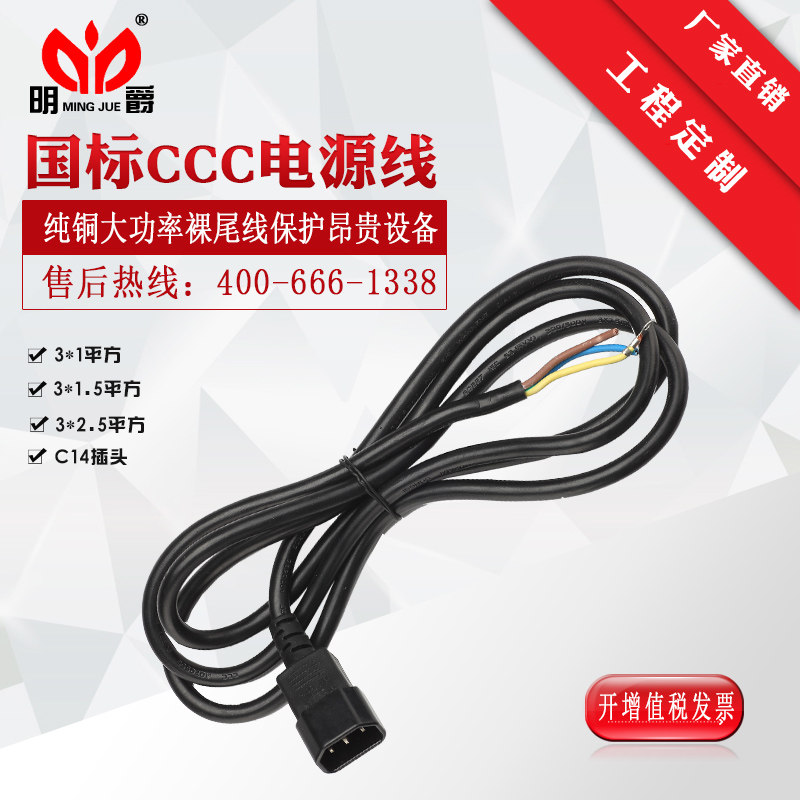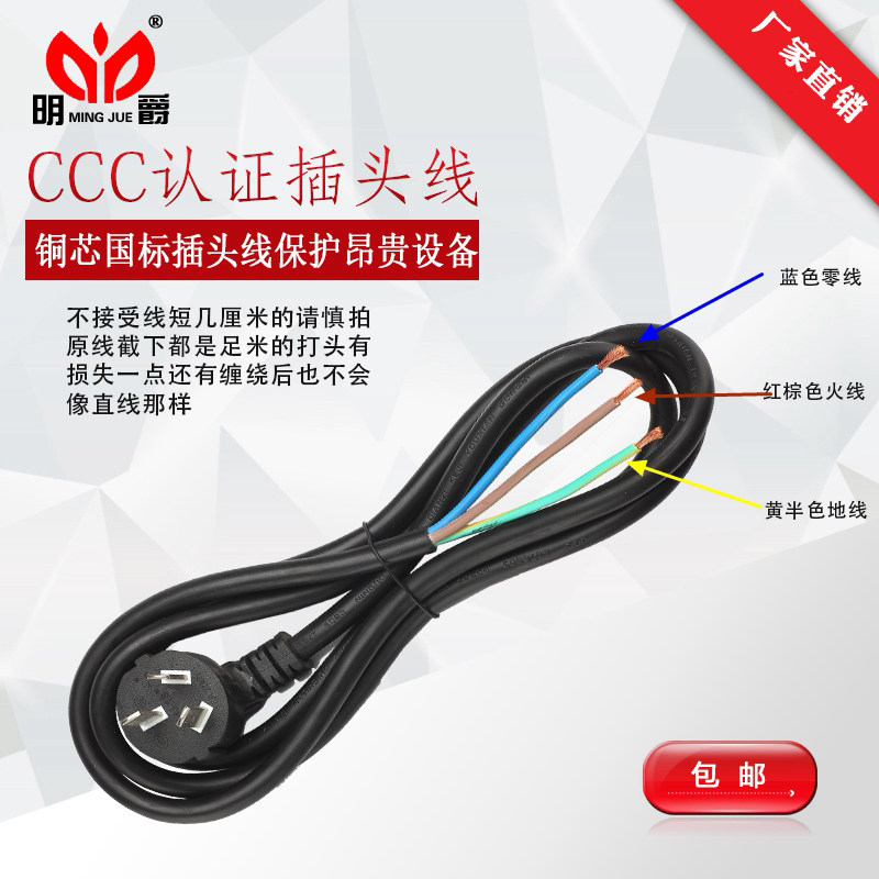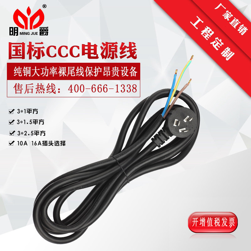 Mingjue three-core plug power cord with 16A10A national standard RVV3 foot cable industrial high-power household wholesale