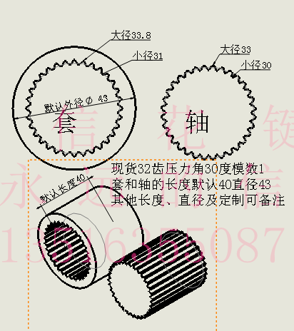 32-tooth spline shaft sleeve pressure angle 30° modulus 1 set large diameter 33 8 small diameter 31 shaft large diameter 33 small diameter 30