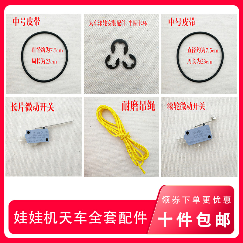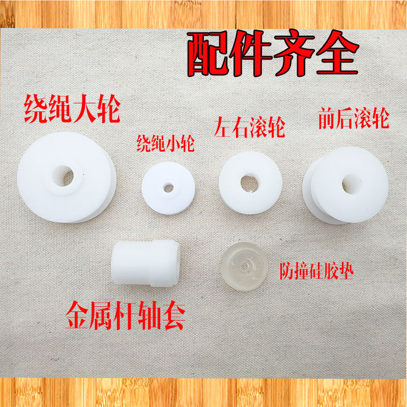 White gear, one screw, wear-resistant crane rope, one small Belt, One medium belt, one large Belt, One wear-resistant gear, one copper gear, one anti-collision silicone pad, one left and right rollers, one front and rear