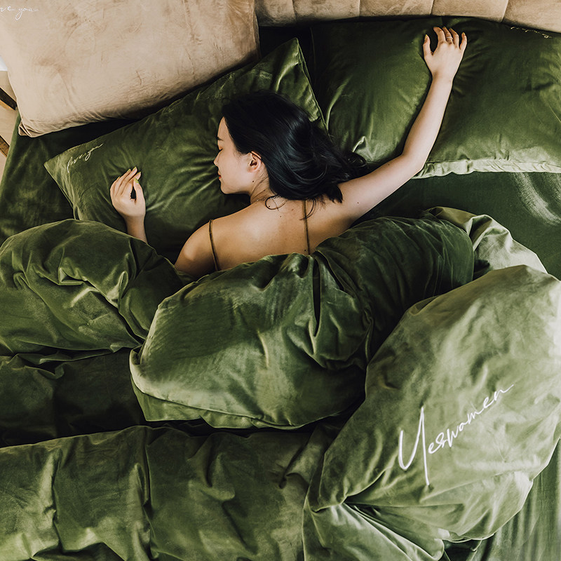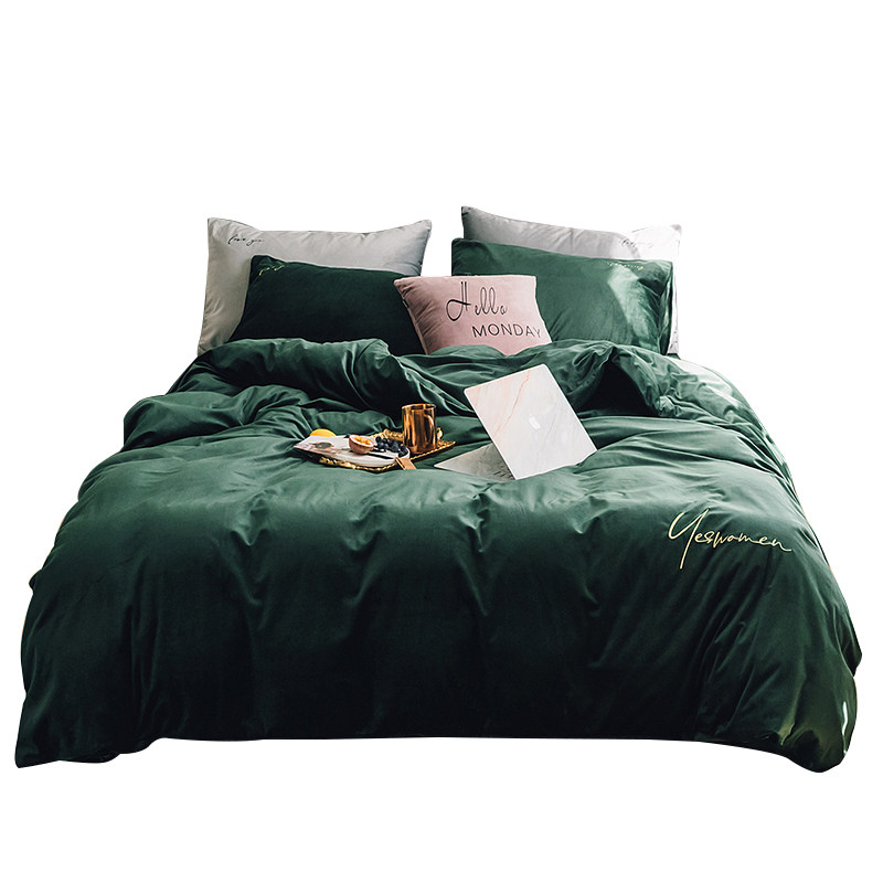 Thickened warm plain color embroidered coral fleece four-piece set simple flannel quilt cover double bed sheet bedding