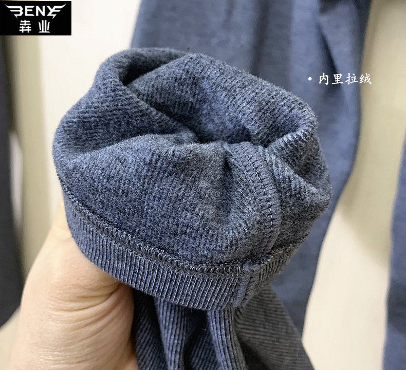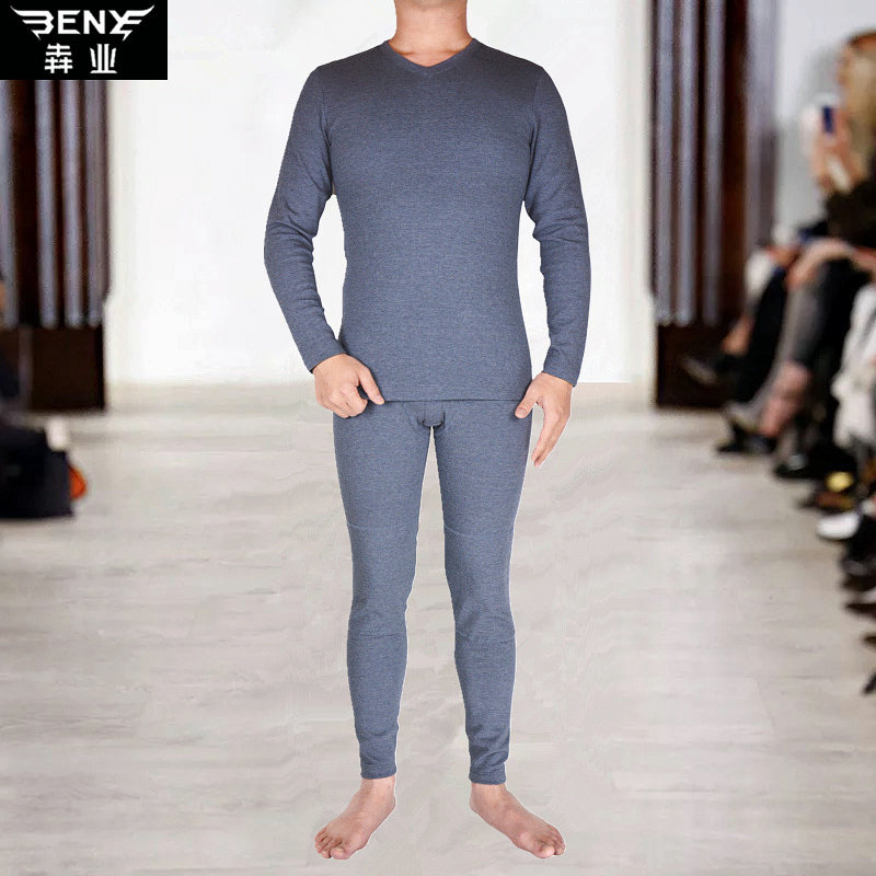 Benye autumn and winter men's warm clothes suit brushed inner brushed V-neck single-layer knee pads slim fit sanitary pants E131