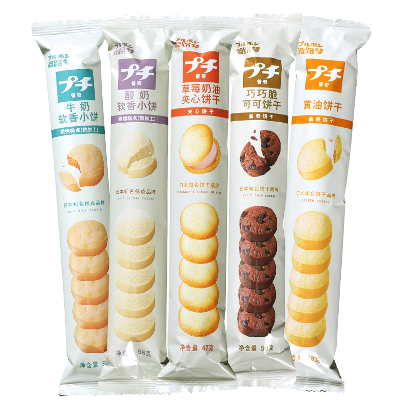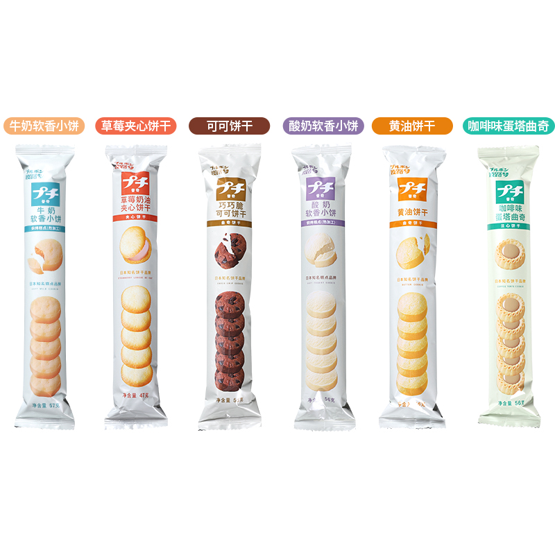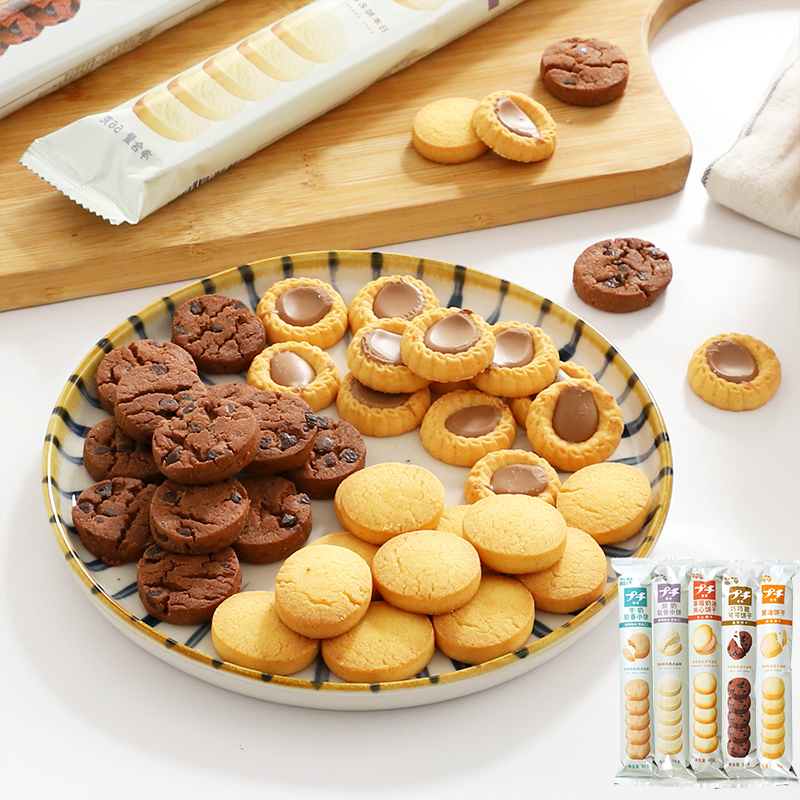 Yogurt soft-flavored cookies 56g milk soft-flavored cookies 57g cream cookies 56g cocoa cookies 56g strawberry sandwich cookies 47g coffee-flavored egg tarts cookies 56g cheese-flavored sandwich cookies 4