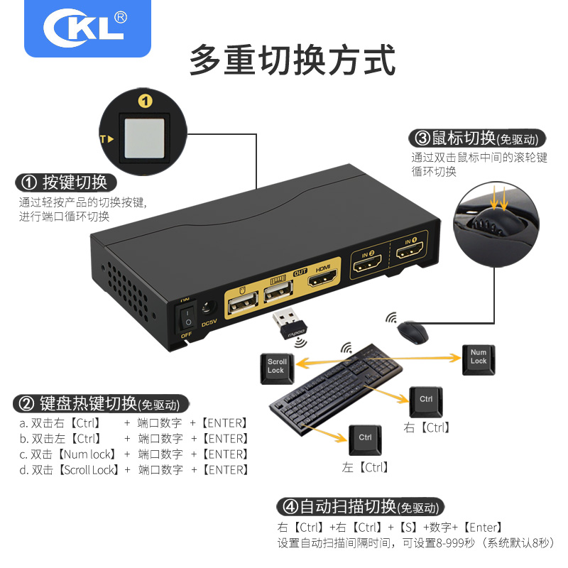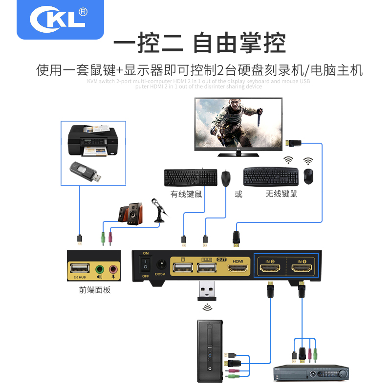 KVM Switch HDMI Automatic 4K30hz 2 in 1 out shared keyboard and mouse audio microphone 62HUA