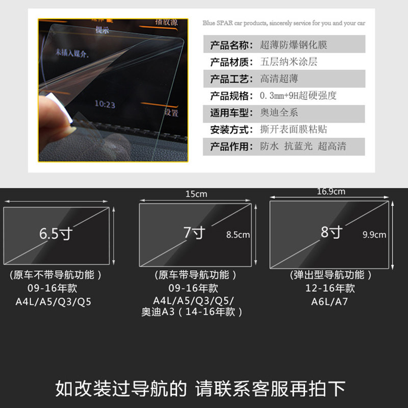 6 5-inch toughened film A4L A4L A5 Q3 Q5 Q5 car without 7 inch steel chemical film A4L A4L A5 Q3 Q5 Q5 car with navigation function 8 inch steel culture film (12-1)