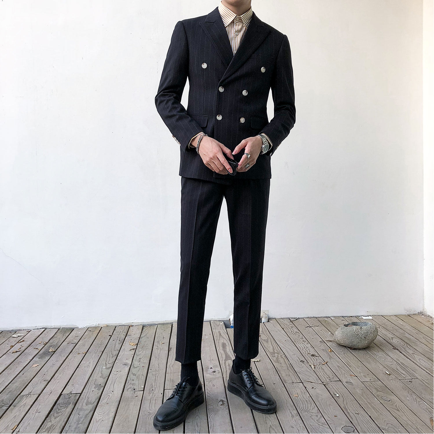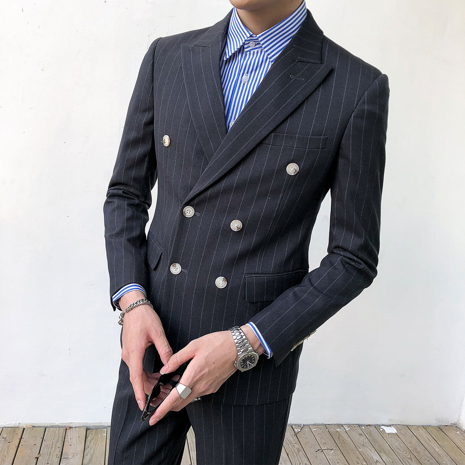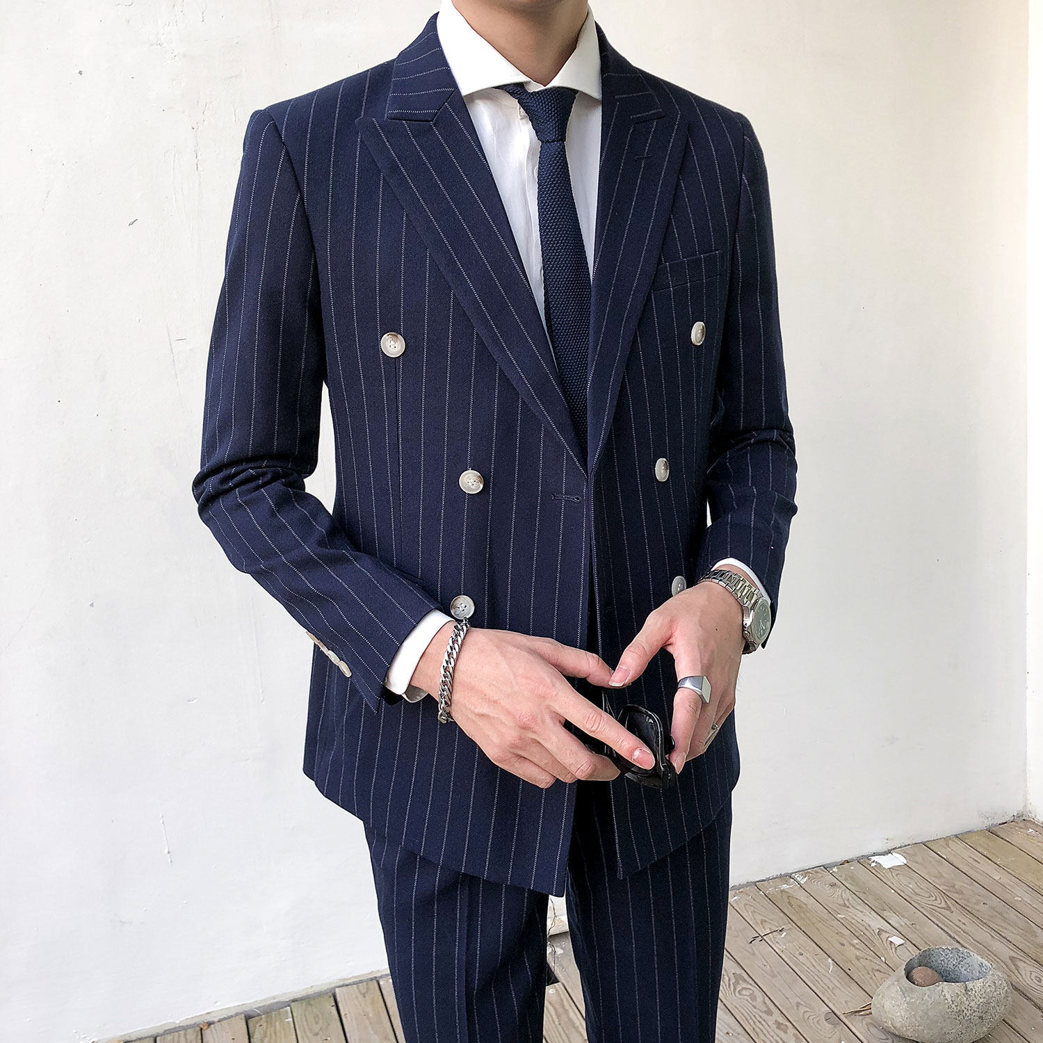 Dongdaemun new striped suit suit male slim double-breasted Korean version suit two-piece groom wedding dress