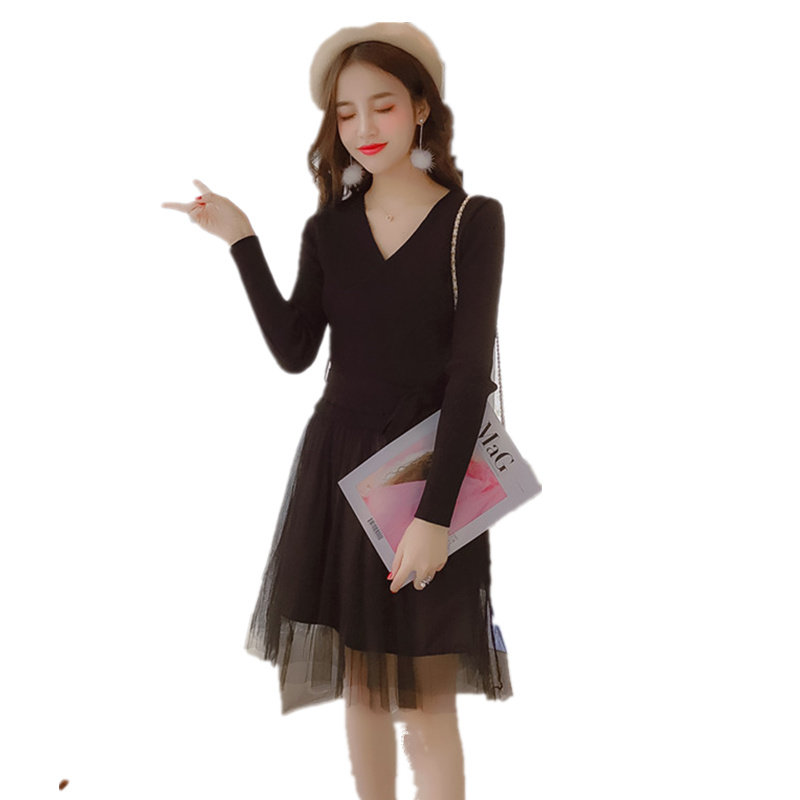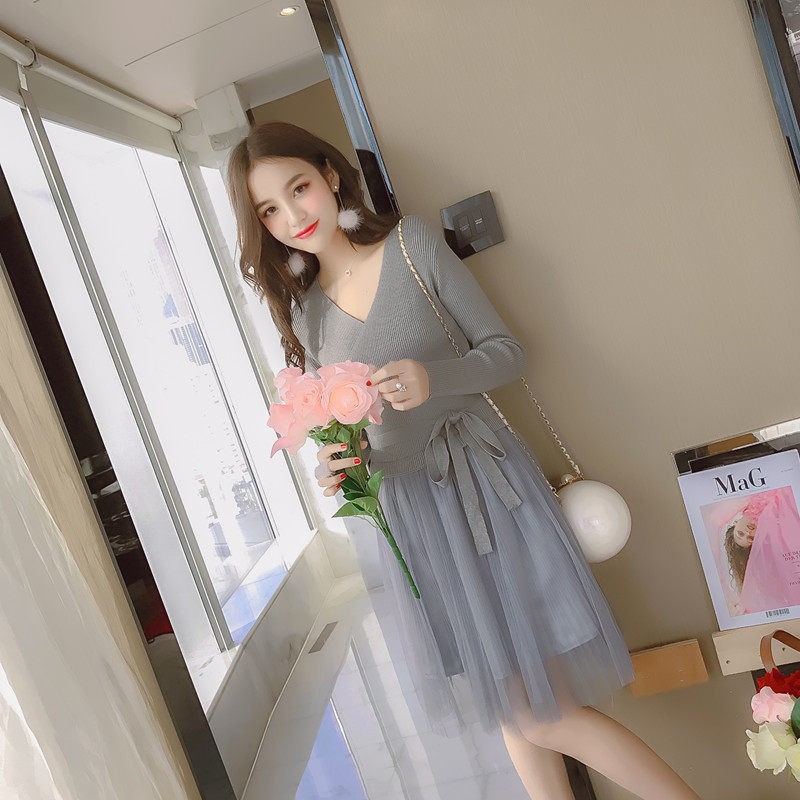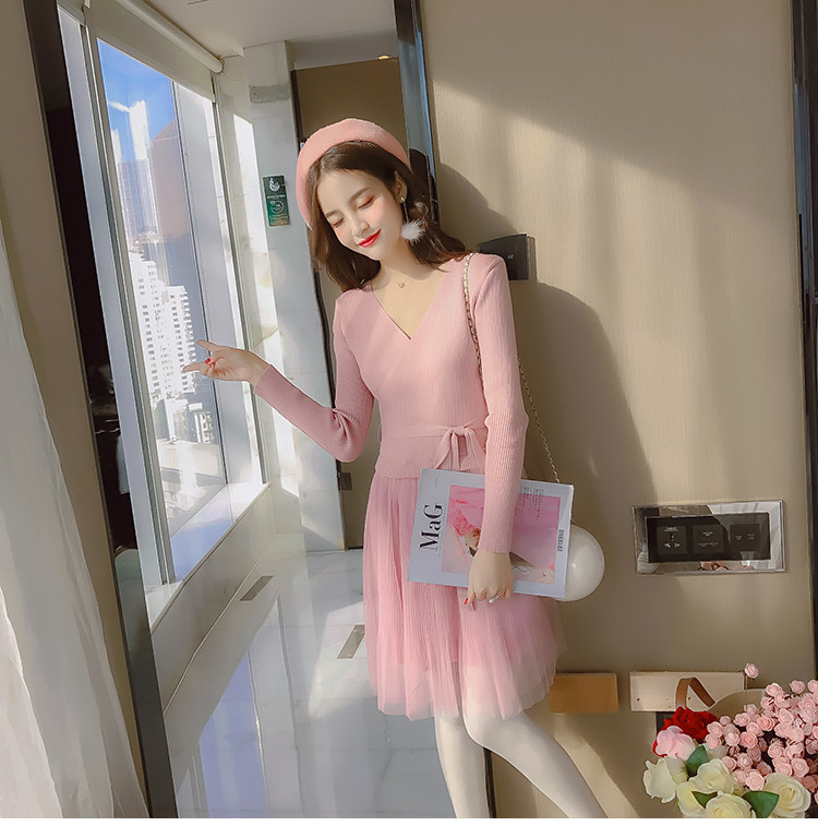 Spring dress lady 2022 new knitted splicing mesh yarn lacing foreign dress Long sleeves 100 pleats cashew waist display slim fit dresses