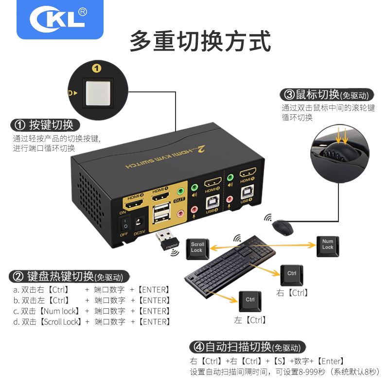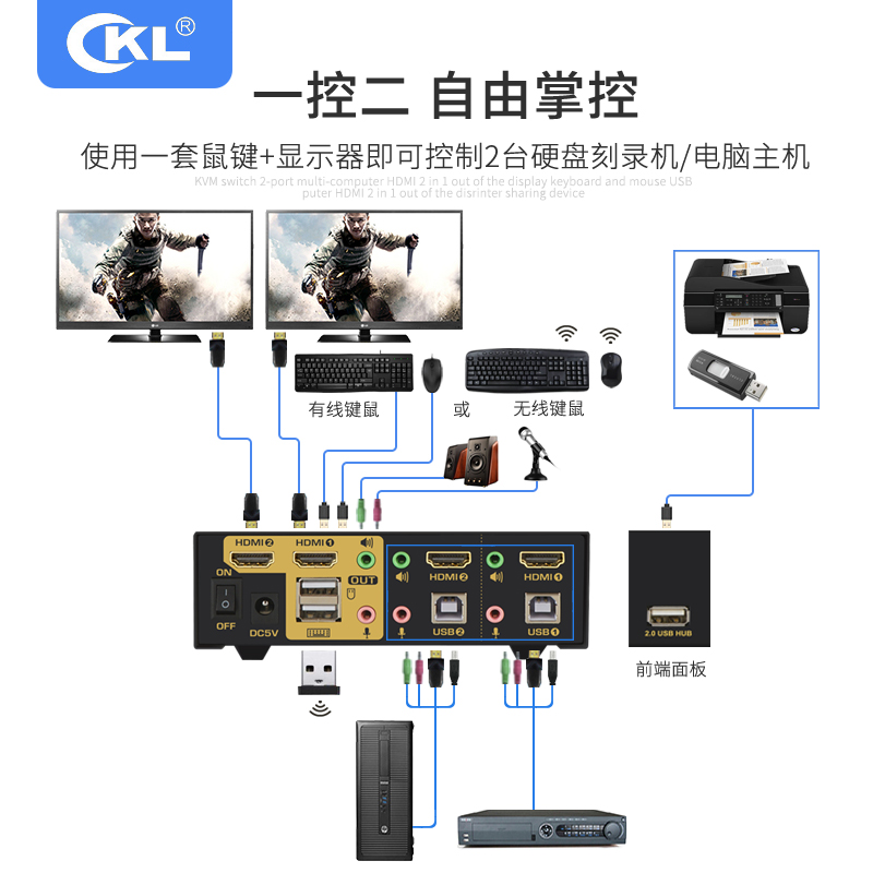 KVM switch 2 ports USB automatic HDMI 2 in 1 out shared keyboard and mouse audio microphone 92HUA