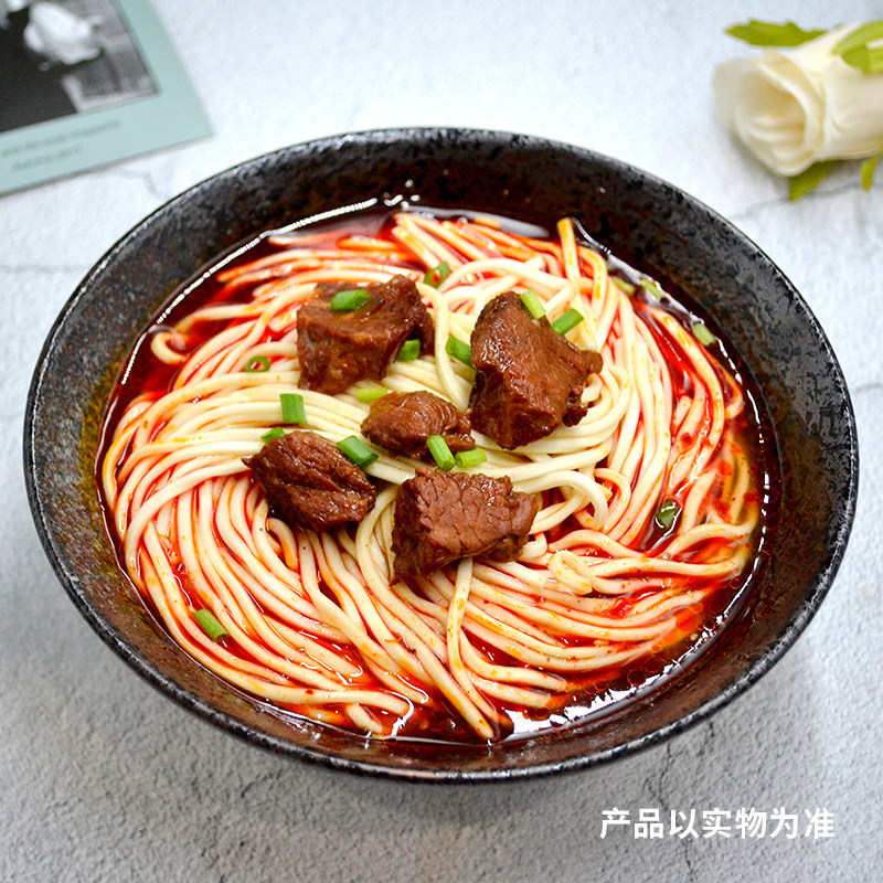Red and burnt beef noodle watering the top of the face.
