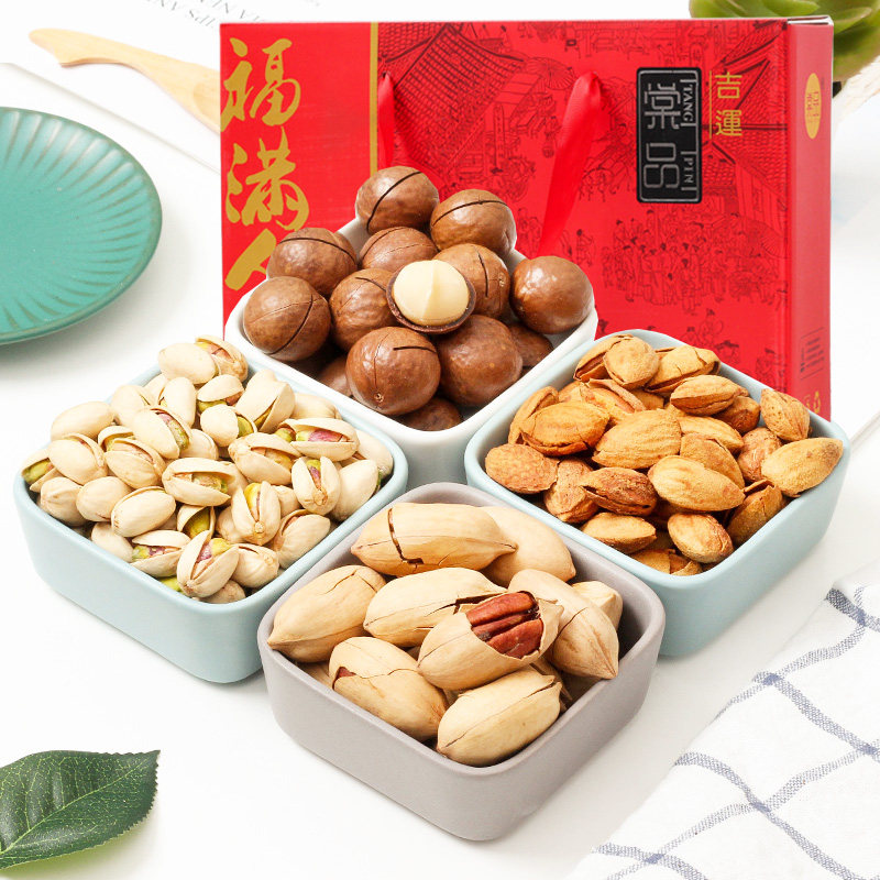 Pecans + Macadamia nuts + alba nuts ( 3 species of 250 grams each 3 cans of net content of 450g) (large particles new) macadamia nuts + pecans (2 kinds of 250 grams each 2 cans net content of 300g) (large particles of new goods) Pistachios + macadamia nuts + pecans (3 kinds of 250 grams each 3 cans net content of 450g) (large particles of new goods) Pistachios + pecans + macadamia nuts + almond wood (4 kinds of 250 grams each 4 cans net content of 600g) (large granules new goods) 4 cans of gift boxes (pistachios + pecans + macadamia nuts + Badan wood 4 models each 250 g 4 cans net content 600 g)