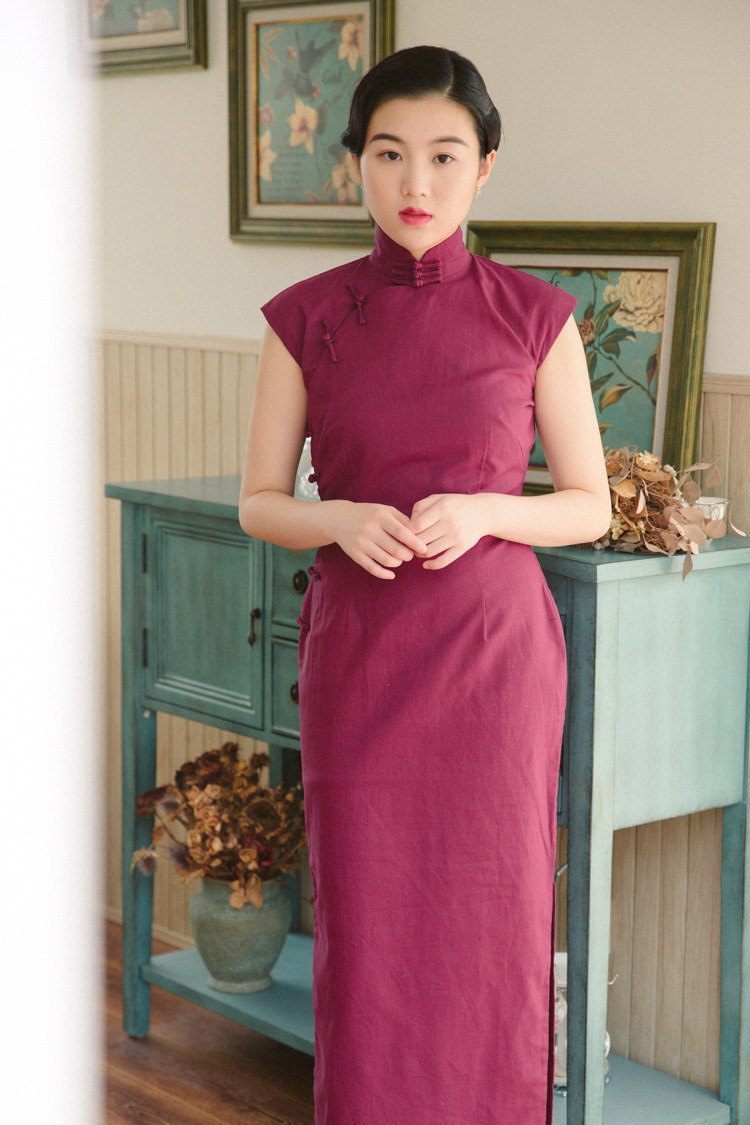 (Clear) Momo small sleeves half open front long section retro daily solid color linen cheongsam plum wine