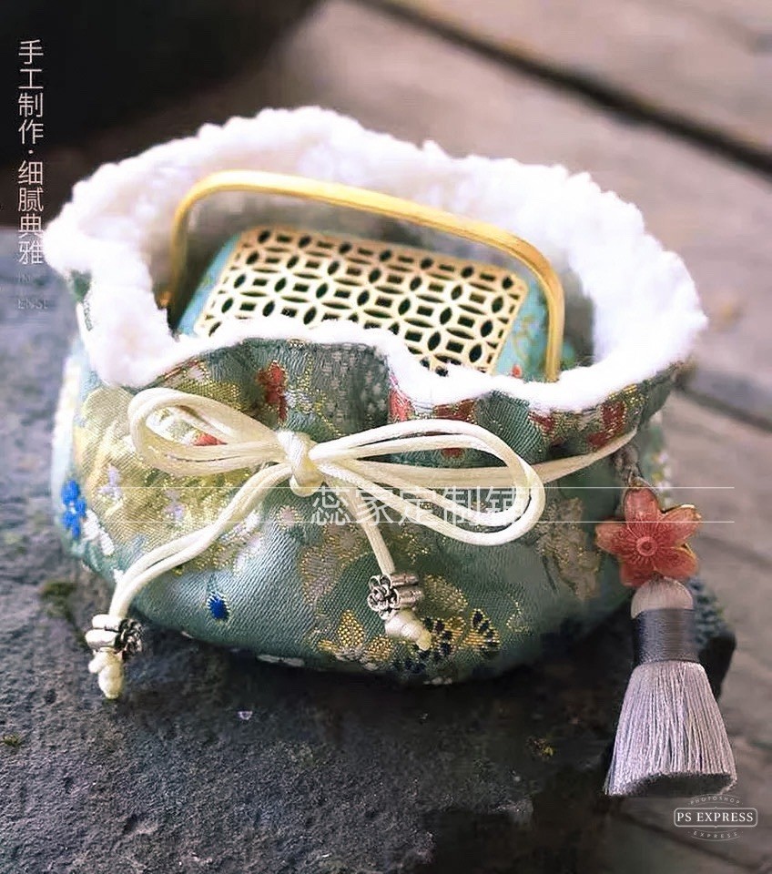 Recommended brocade green group flower hand stove bag soup woman cloth vintage lamb wool 10cm spot this empty bag