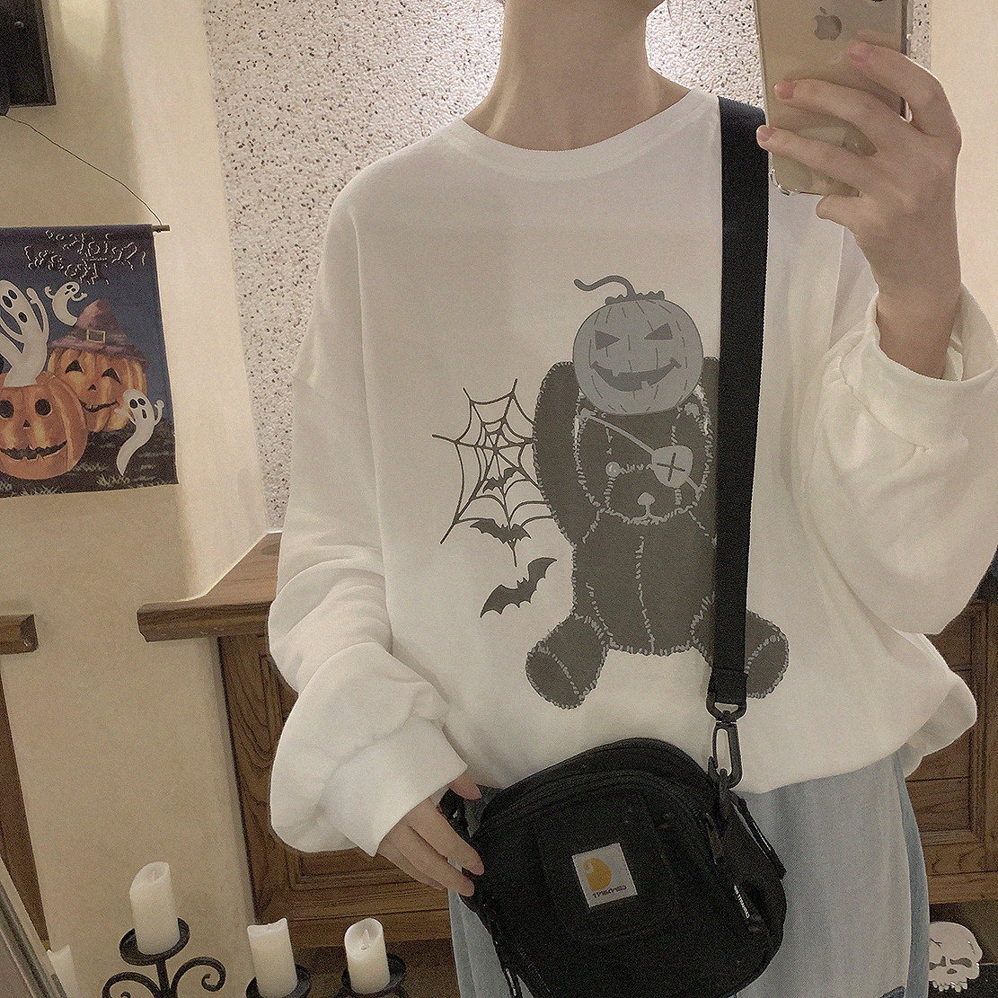 Original Halloween monocular pumpkin small Bear wool side white loose long sleeve T-shirt H